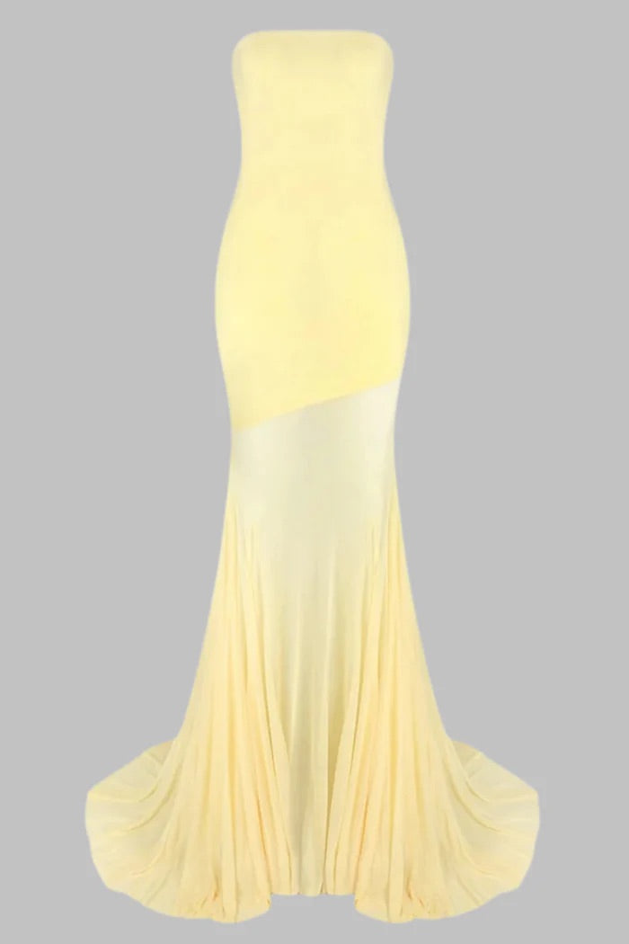 Embrace effortless elegance in this strapless body-hugging maxi dress, featuring a sleek silhouette and sheer mesh panels from mid-thigh down. The soft yellow hue and flowing hem create a dreamy, ethereal look—perfect for sunset soirées, beach weddings, or special summer occasions.