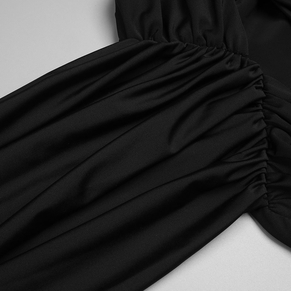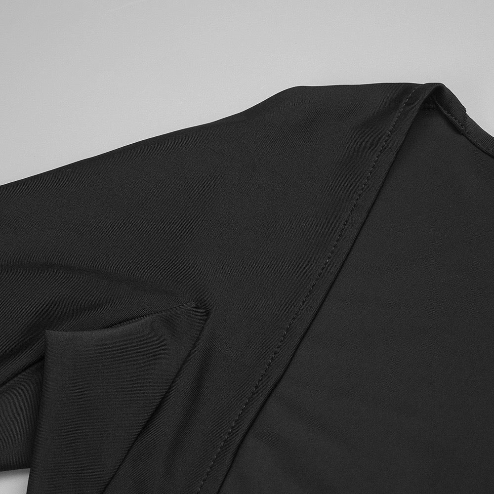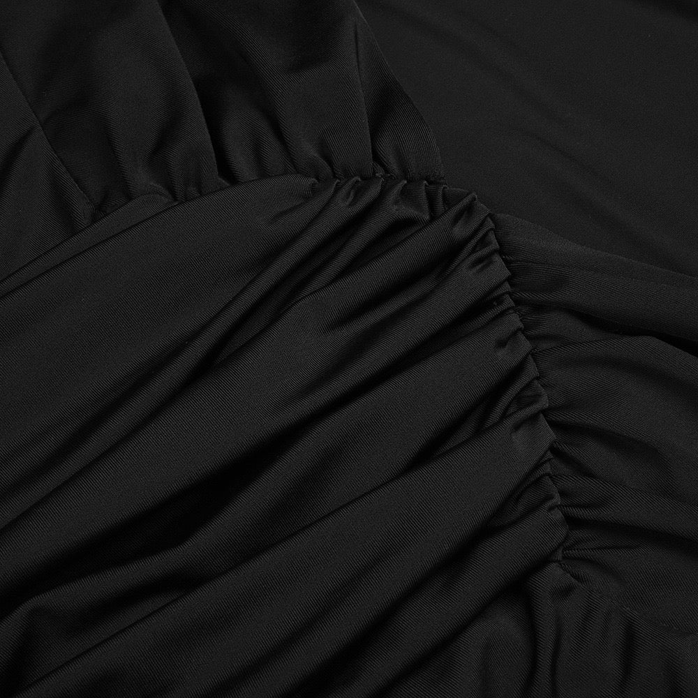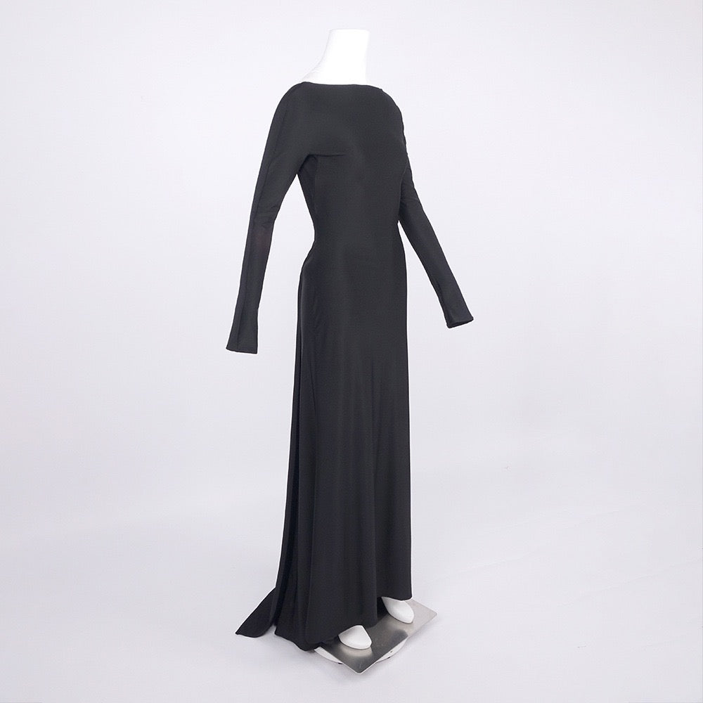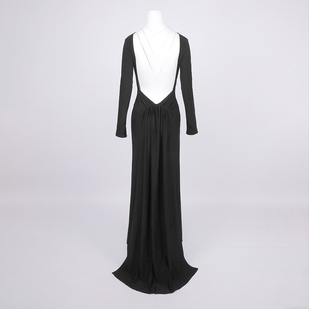 Crafted from soft stretch jersey, this elegant long dress features a sleek fitted silhouette with full-length sleeves and a dramatic open-back design. The fluid draping at the back flows into a floor-length hem, creating graceful movement and a refined, timeless look perfect for formal evenings and special occasions.