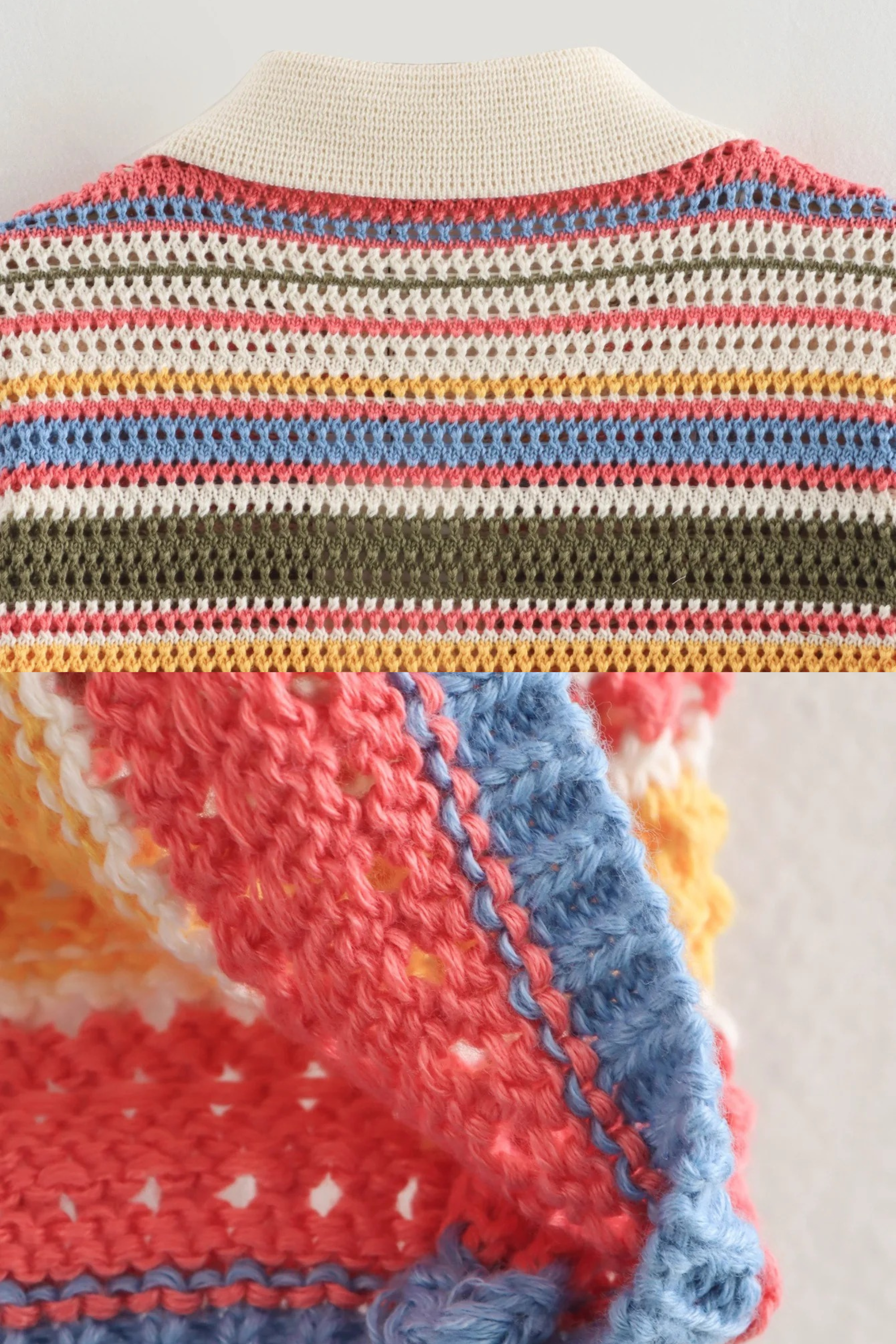 A chic handmade-look crochet set featuring a short-sleeve button-down knit top with a contrast collar and matching high-waist shorts. Designed in soft, breathable yarn with colorful retro stripes, this set combines comfort with effortless summer style. Perfect for beach strolls, brunch dates, or vacation days, it offers a relaxed yet fashionable vibe.