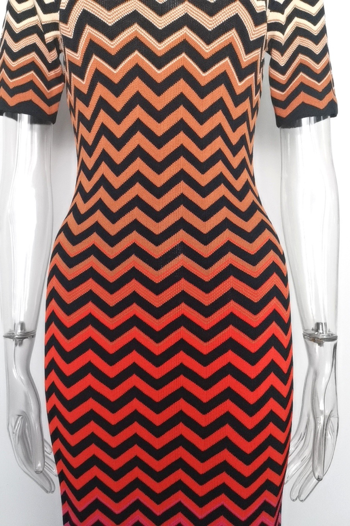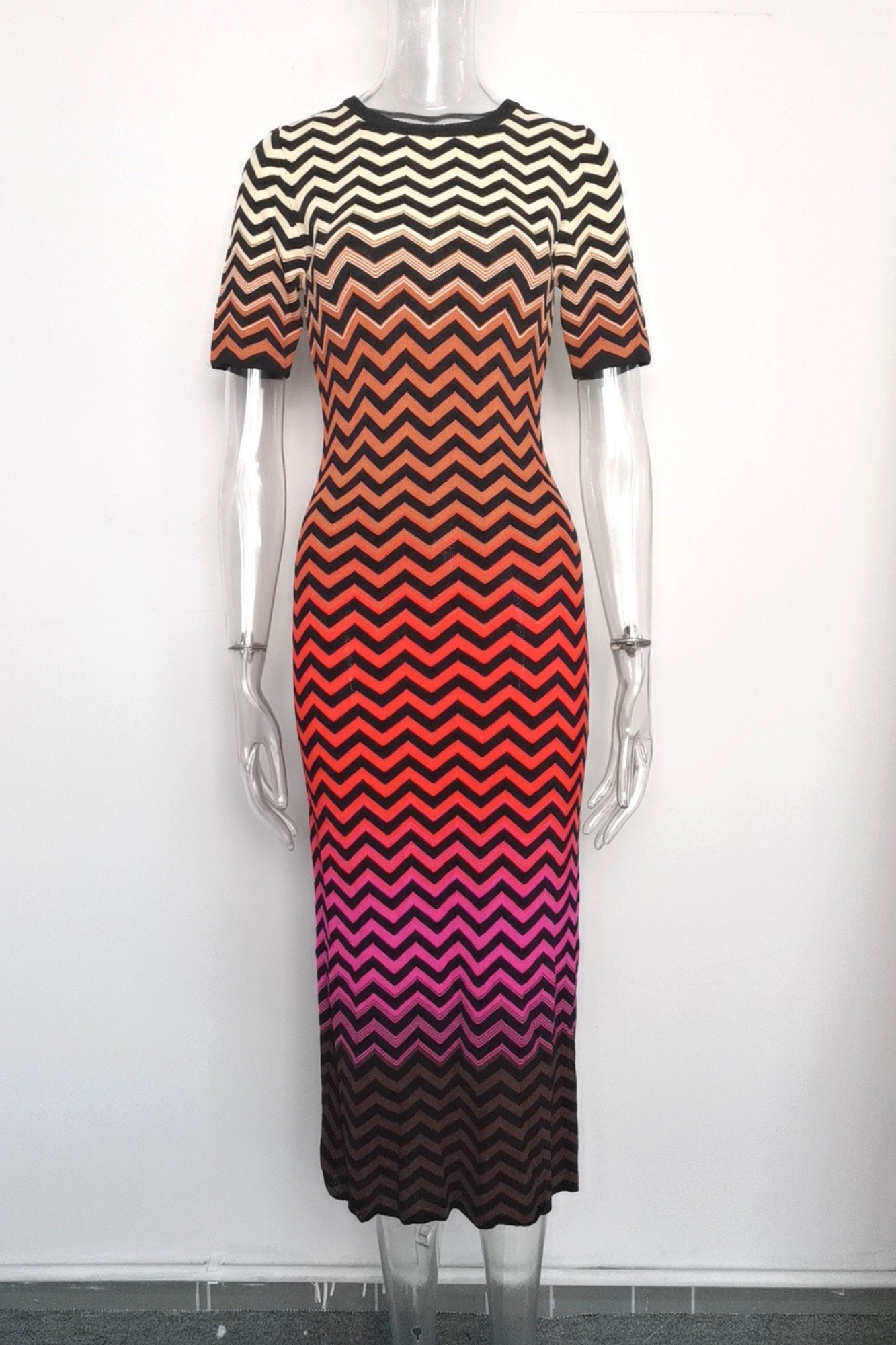 Sunset Chevron Short Sleeve Gradient Knit Patterned Long Dress