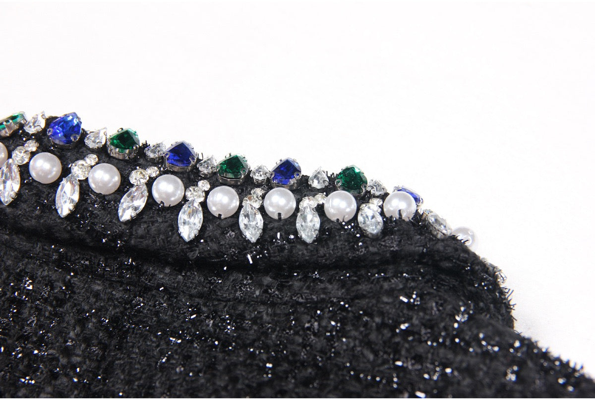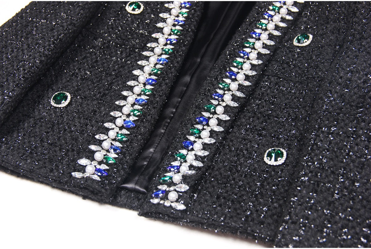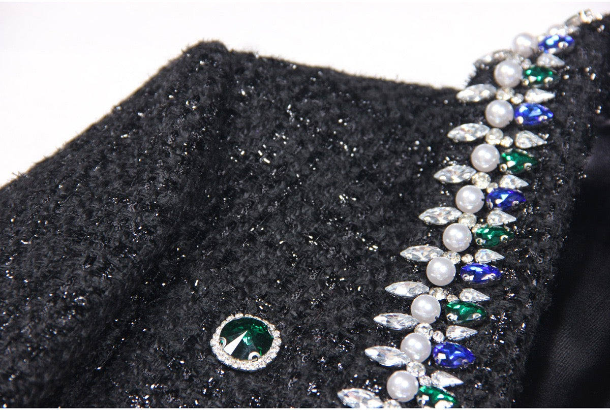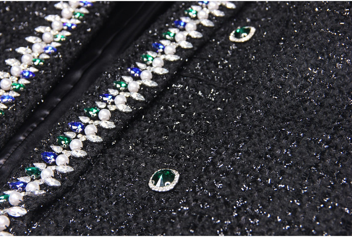A statement piece that radiates timeless luxury, this cropped tweed jacket features hand-embellished gemstone detailing in emerald, sapphire, and crystal tones along the lapels and pockets. The structured silhouette is accented with pearl trim and glittered threads for a subtle shimmer effect. Fully lined for comfort, it pairs beautifully with skirts or tailored trousers for a refined, couture-inspired look.