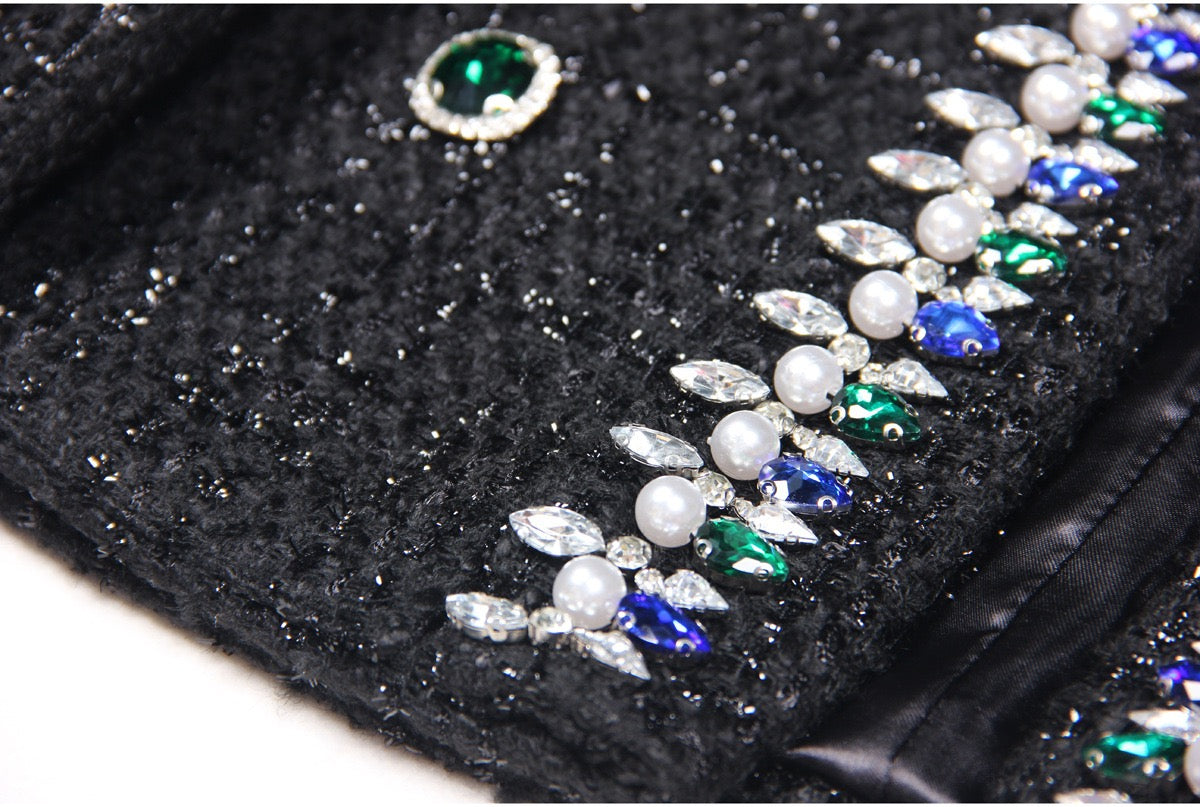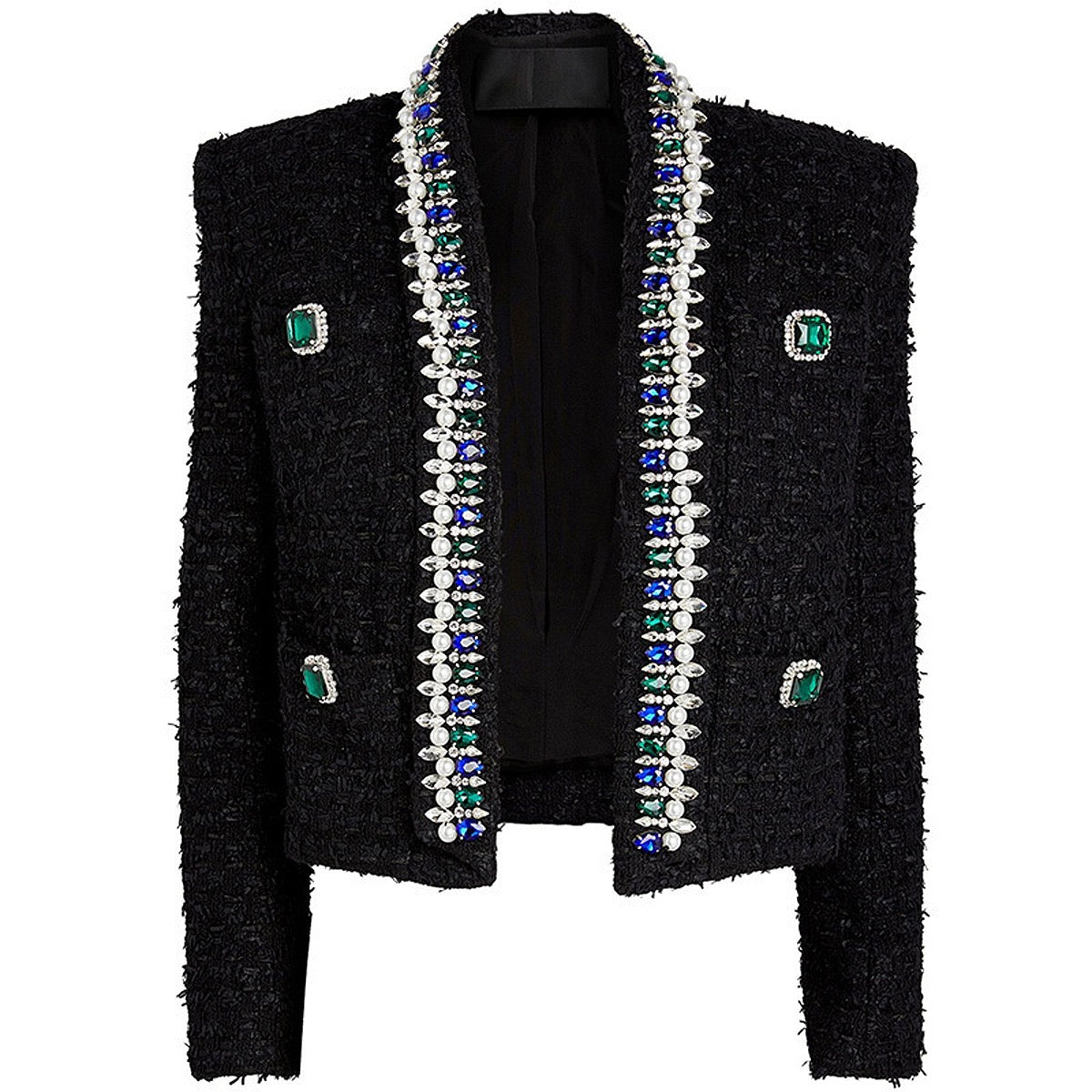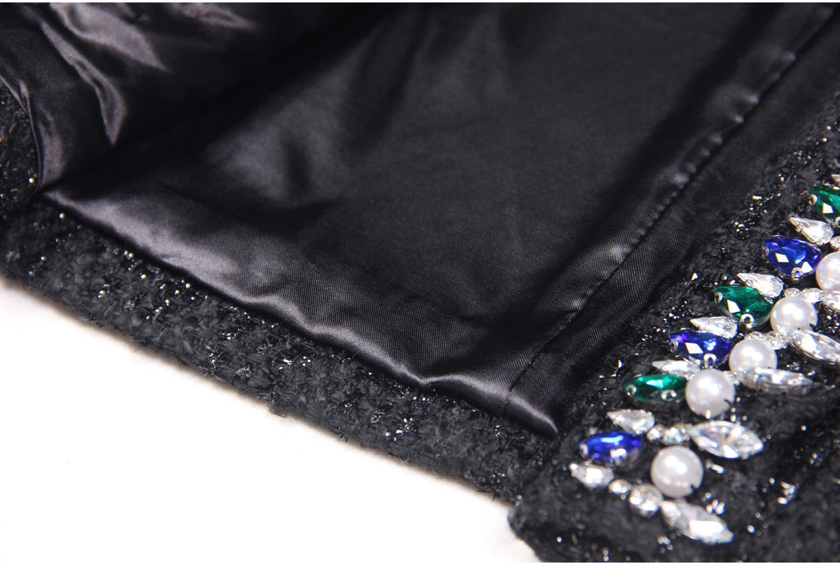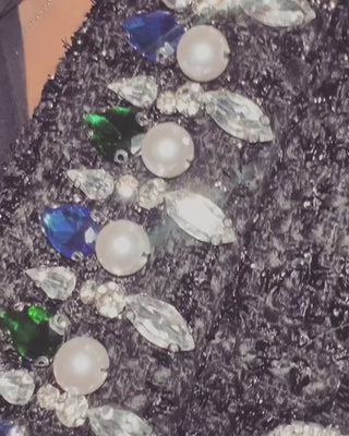 A statement piece that radiates timeless luxury, this cropped tweed jacket features hand-embellished gemstone detailing in emerald, sapphire, and crystal tones along the lapels and pockets. The structured silhouette is accented with pearl trim and glittered threads for a subtle shimmer effect. Fully lined for comfort, it pairs beautifully with skirts or tailored trousers for a refined, couture-inspired look.