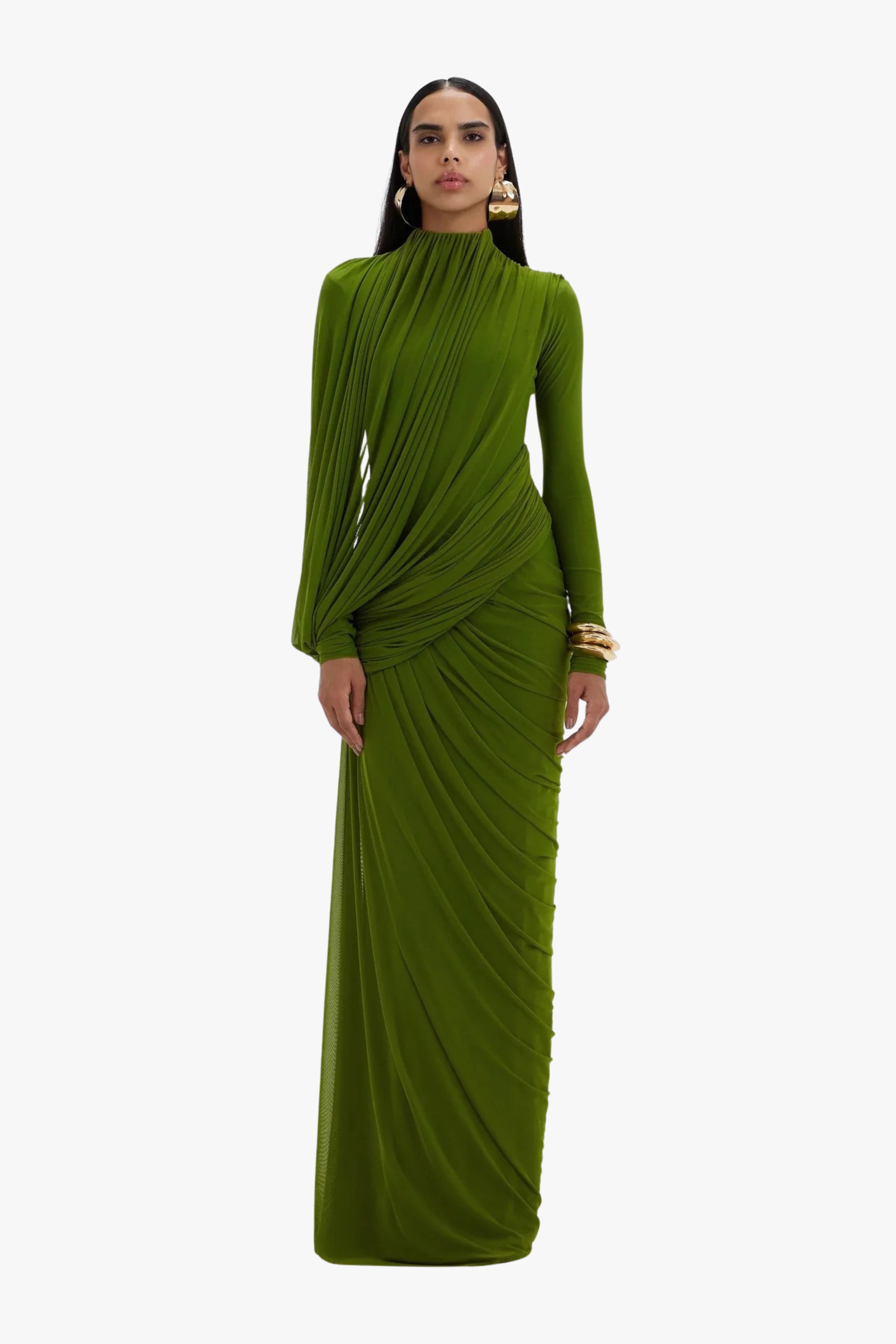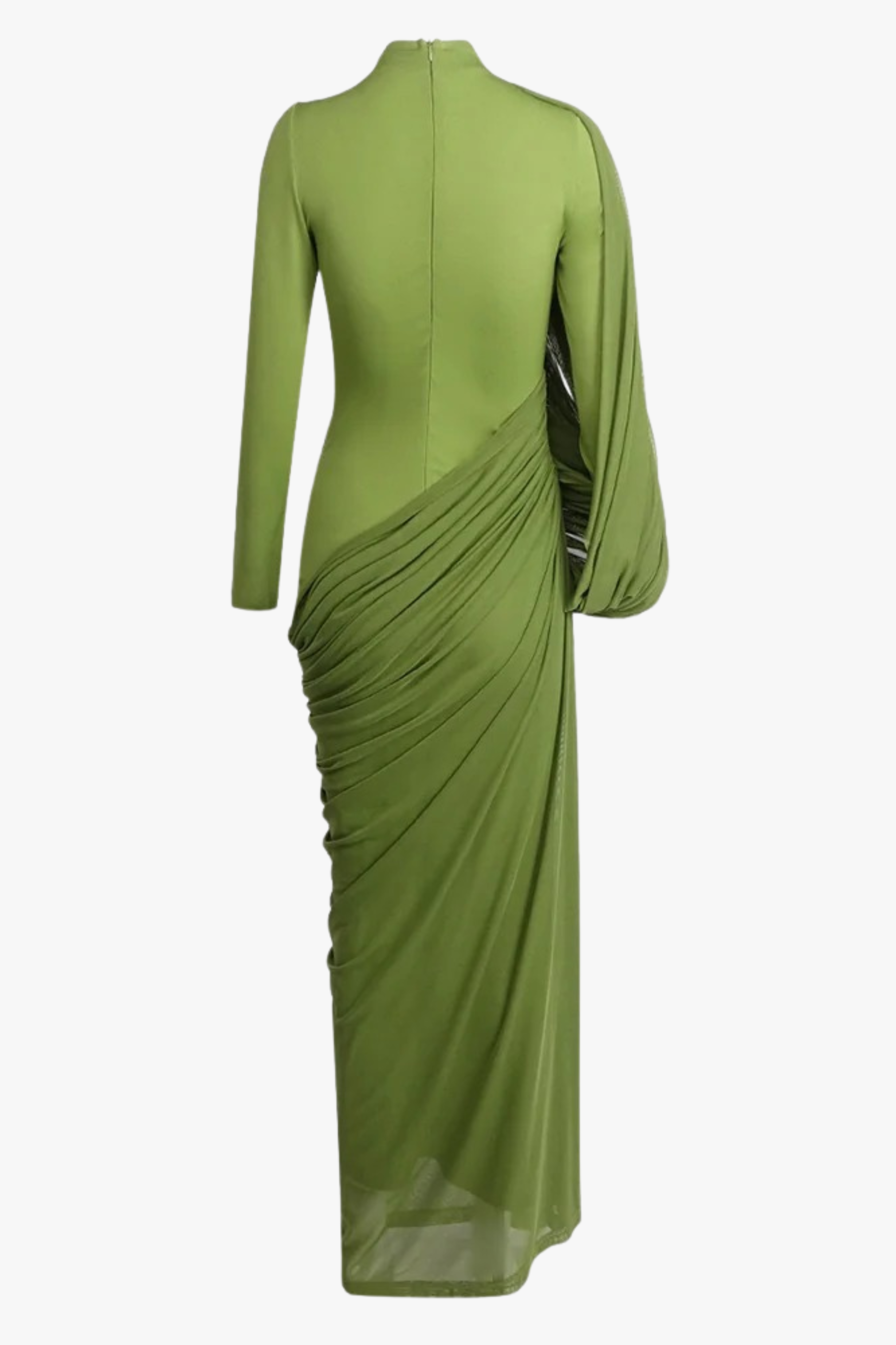 This long mesh dress is defined by its elegant draped design and delicate ruching that flows effortlessly over the body. Crafted from soft, breathable fabric, it features long sleeves that add a refined and graceful touch. The silhouette feels modern yet timeless, making it ideal for special occasions, evening outings, or elevated everyday styling. A statement piece that brings understated luxury to your wardrobe.