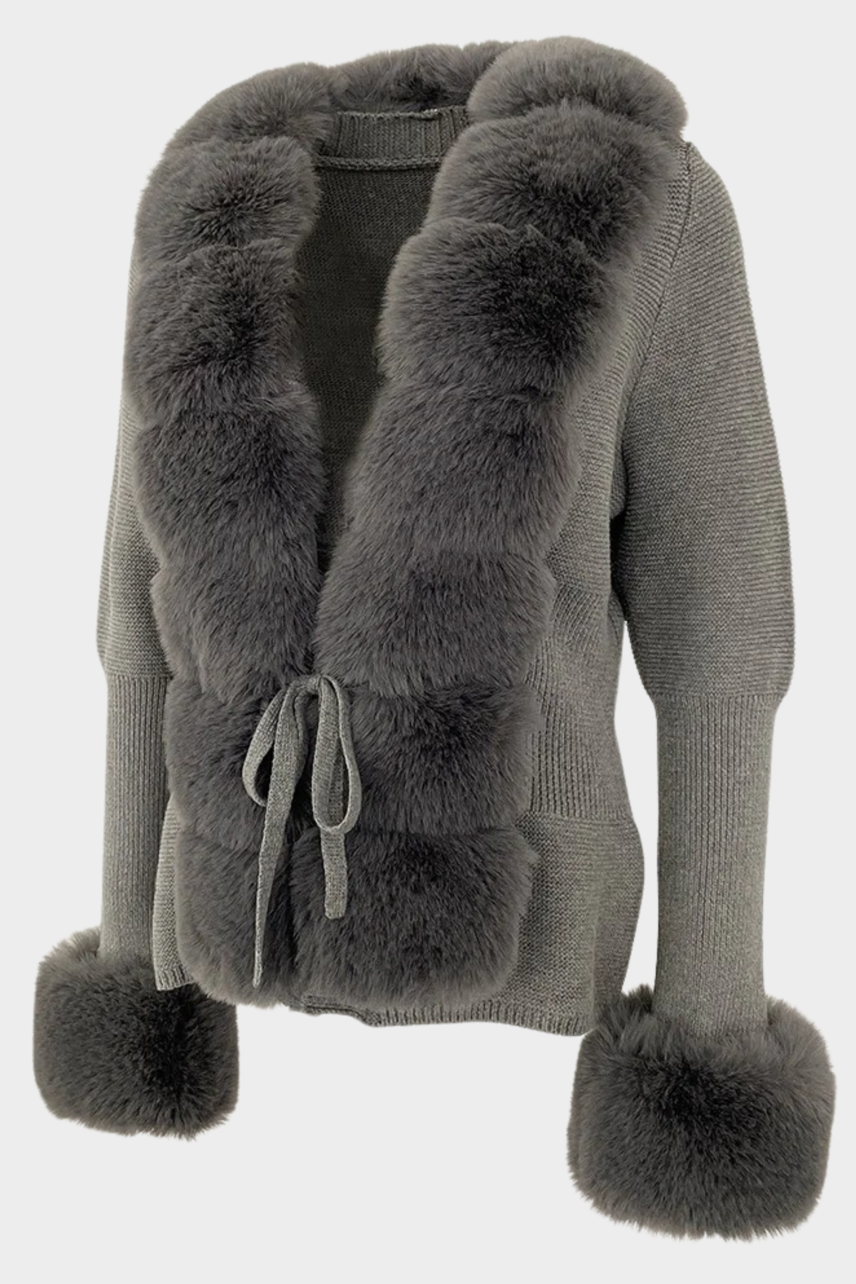 A chic cold-season essential combining soft knit fabric with plush faux fur detailing for a luxurious finish. This long sleeve jacket features voluminous faux fur panels along the front, collar, and sleeve cuffs, creating a rich contrast against the knitted body.