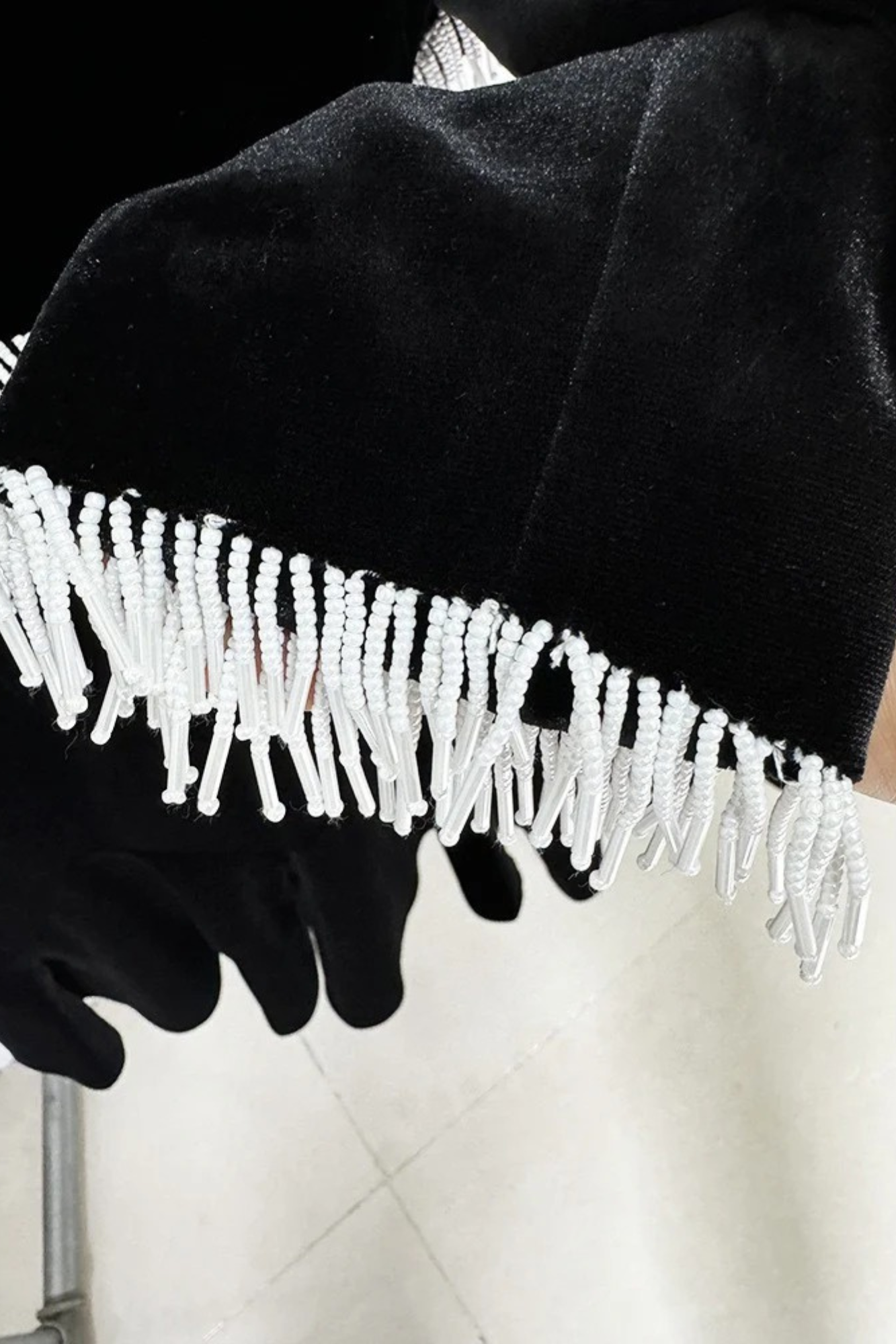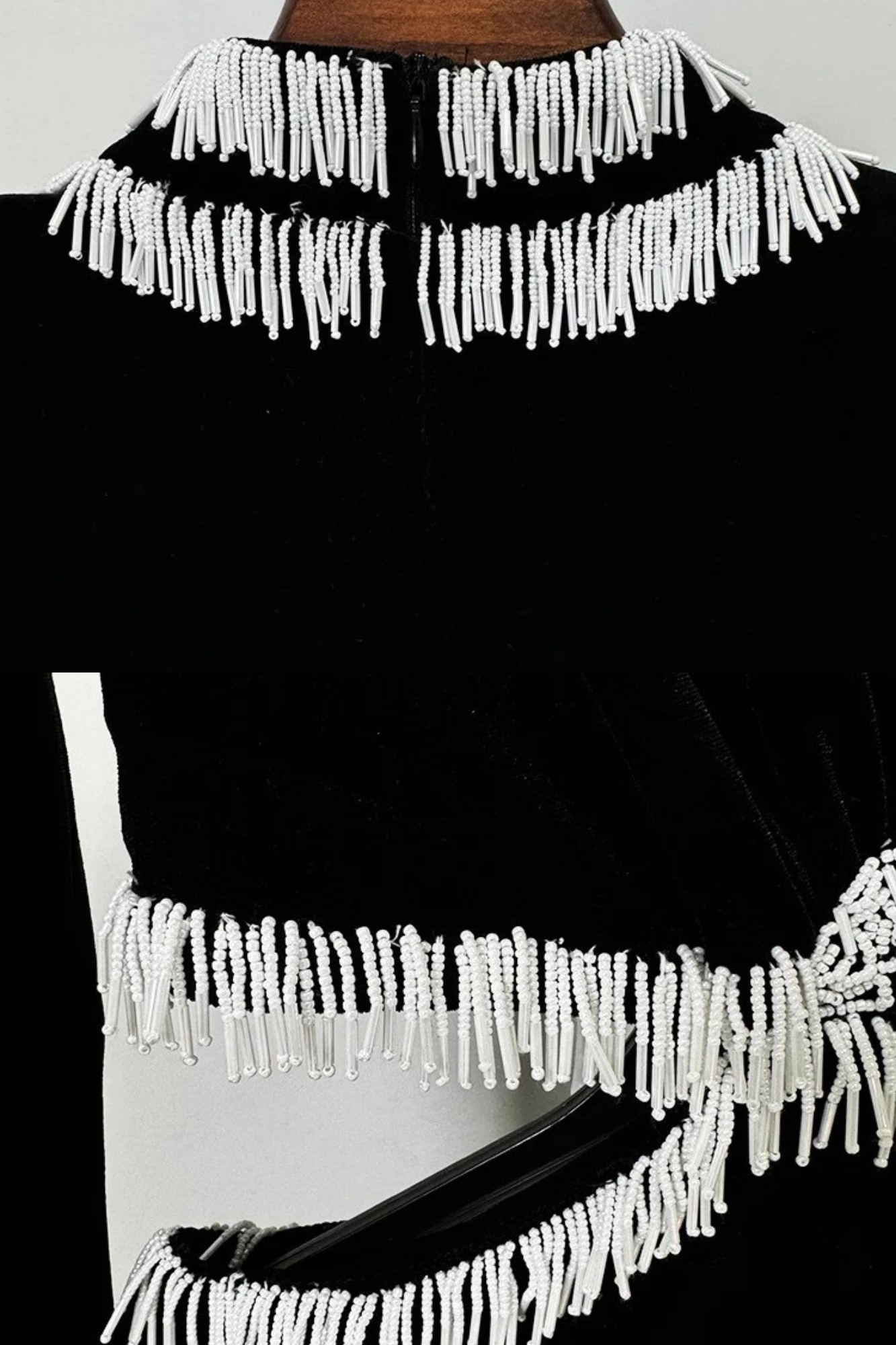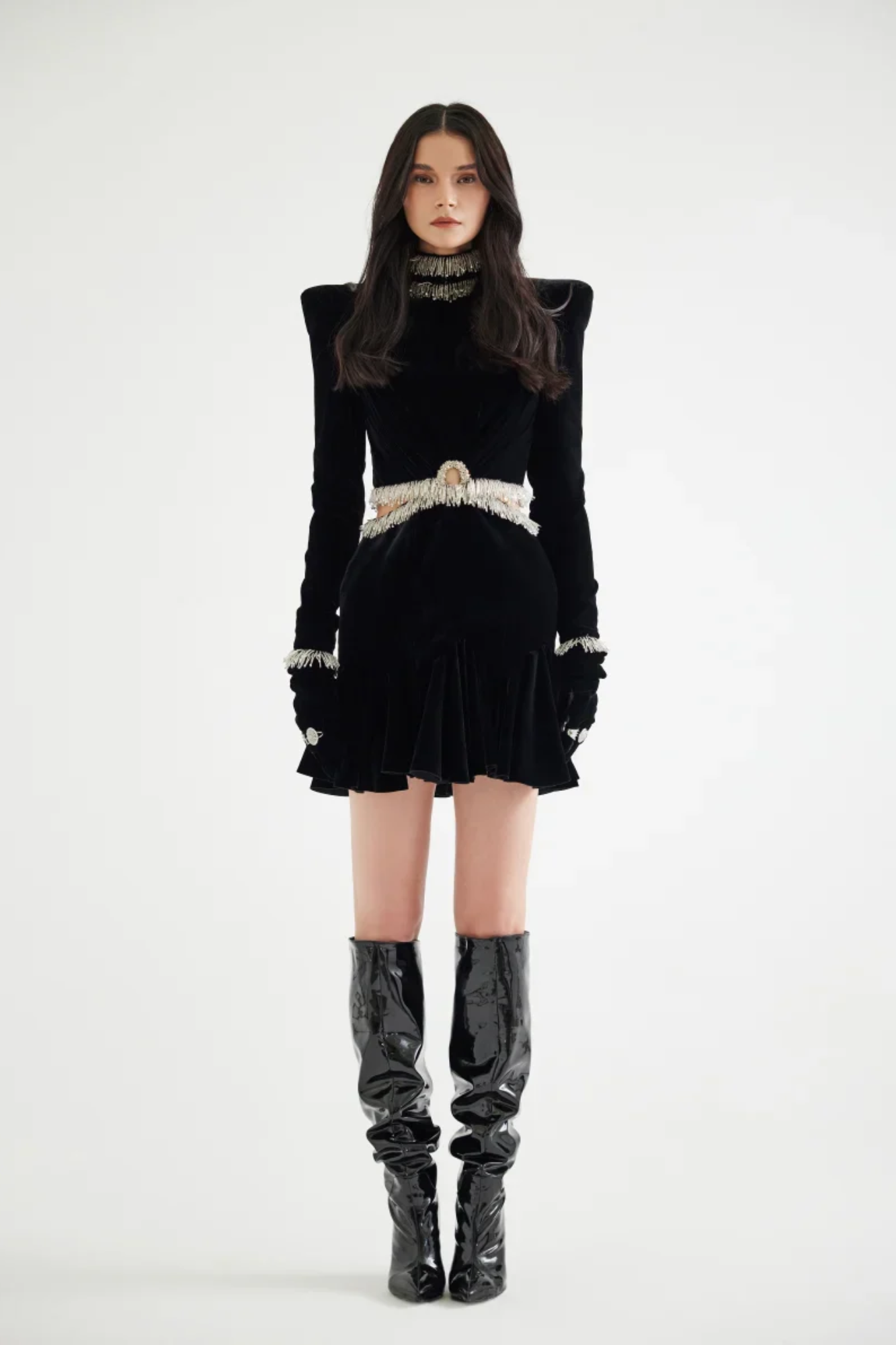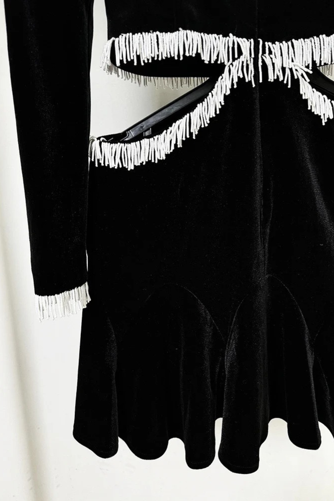 Turn heads in this luxurious black velvet mini dress featuring structured long sleeves, a high neckline with shimmering beaded fringe, and a cinched waist highlighted by statement cutout details adorned with crystal fringe and a jeweled buckle. The flared hemline adds movement and drama, making it the perfect choice for evening parties, special occasions, or glamorous nights out.