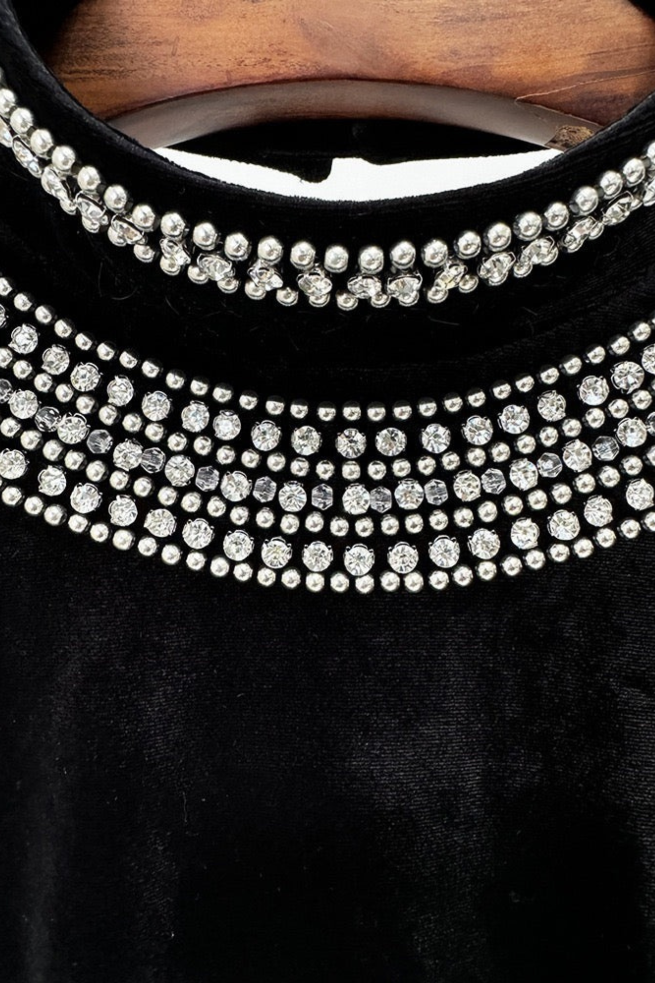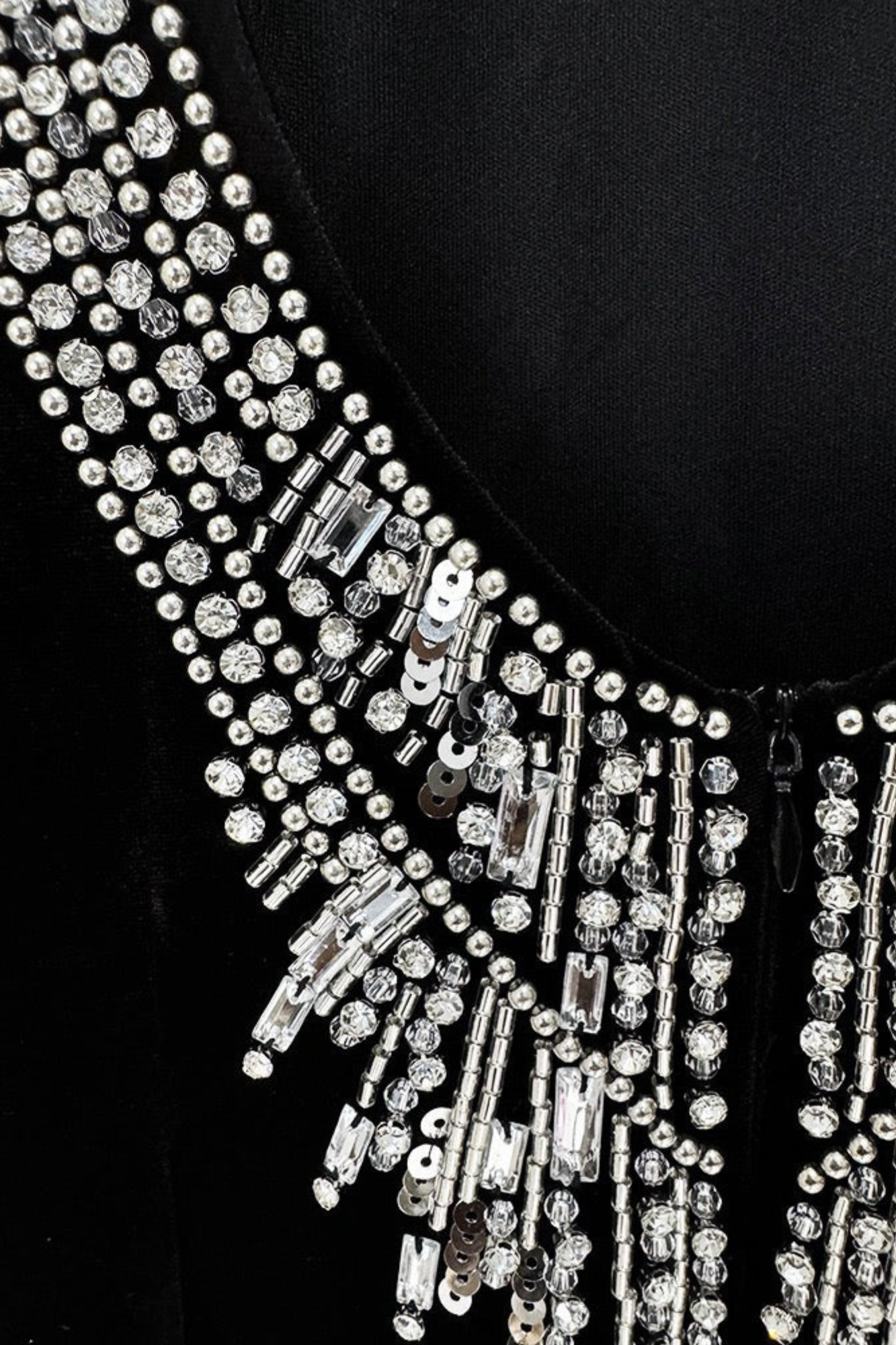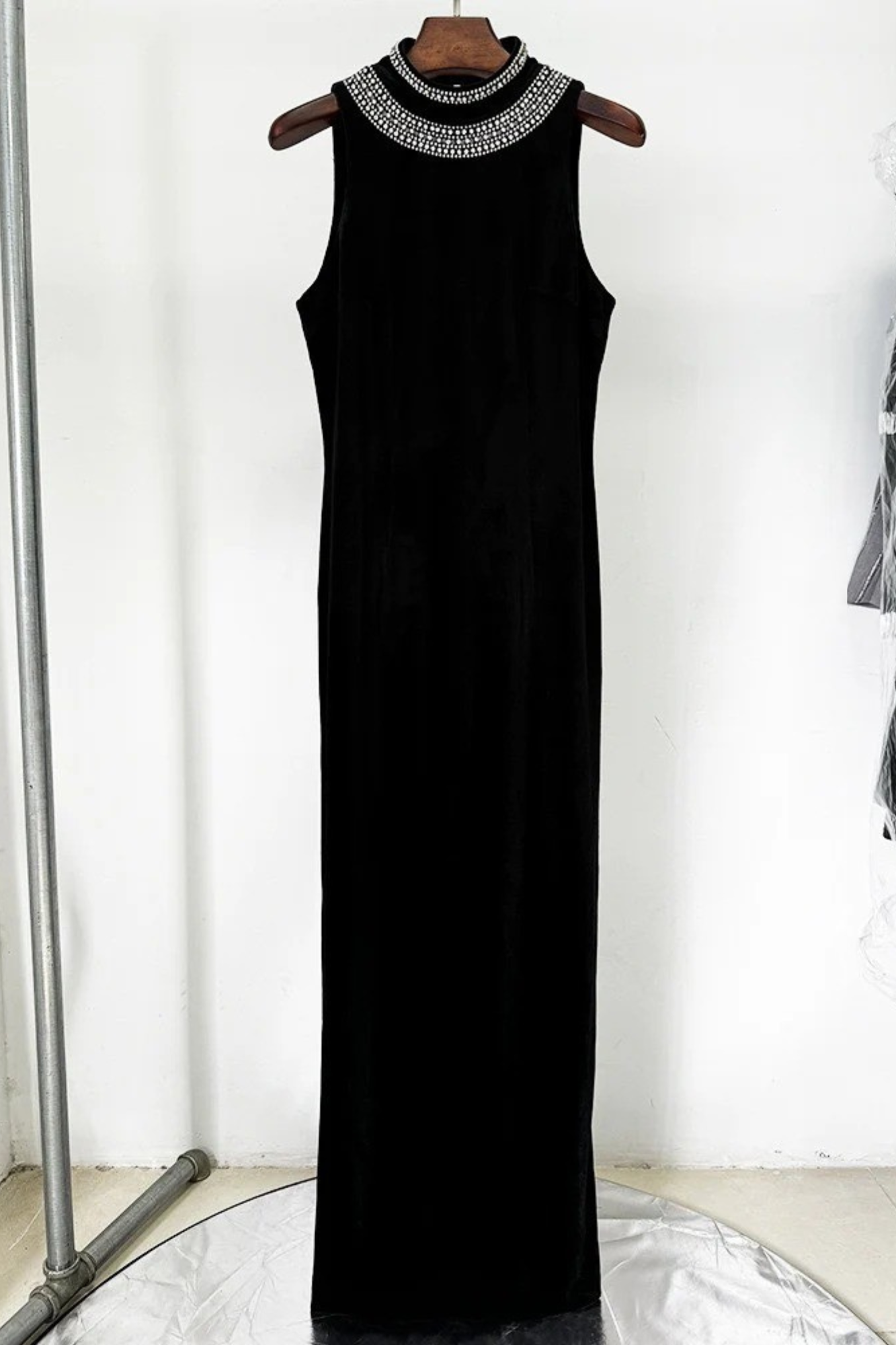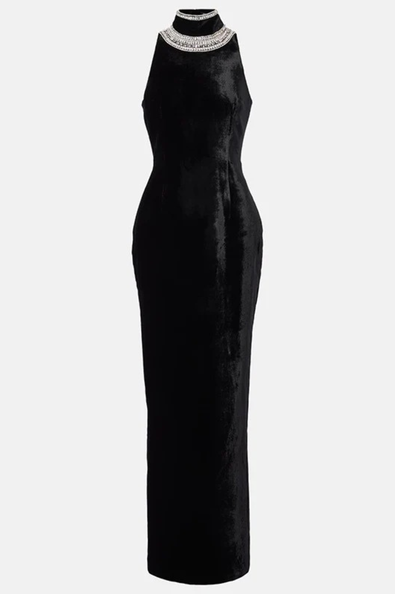 Dazzle in this sophisticated velvet evening gown featuring a sleeveless silhouette, fitted floor-length design, and a dramatic open back framed with cascading rhinestone embellishments. The high neckline is adorned with shimmering crystal details for a jewelry-like effect, making this gown an unforgettable choice for galas, red-carpet events, and elegant evening occasions.