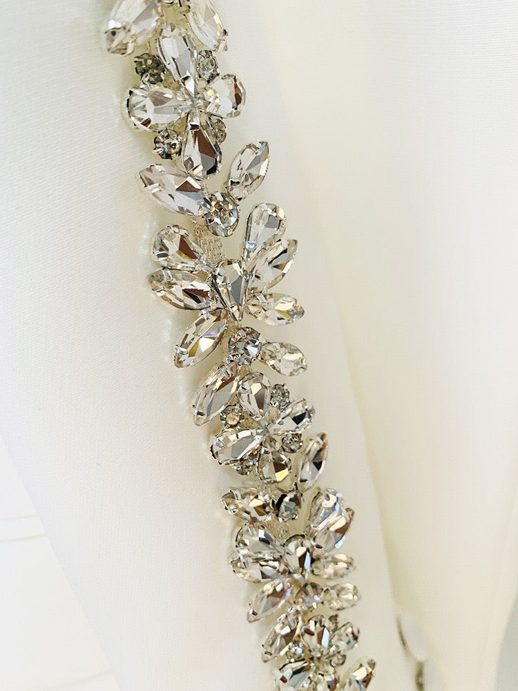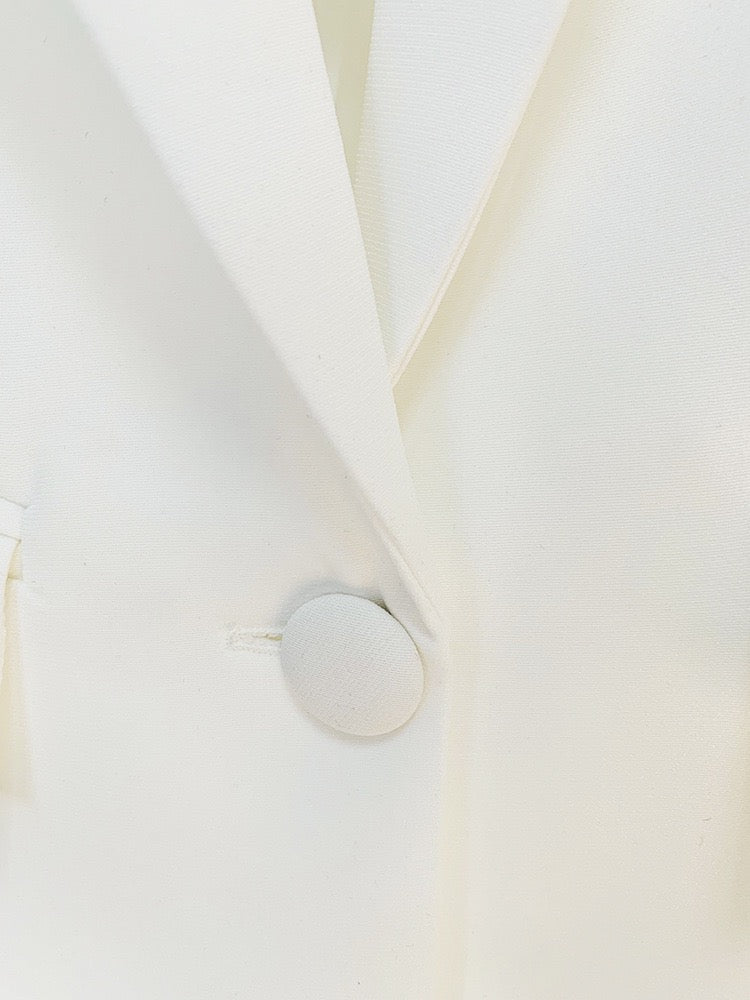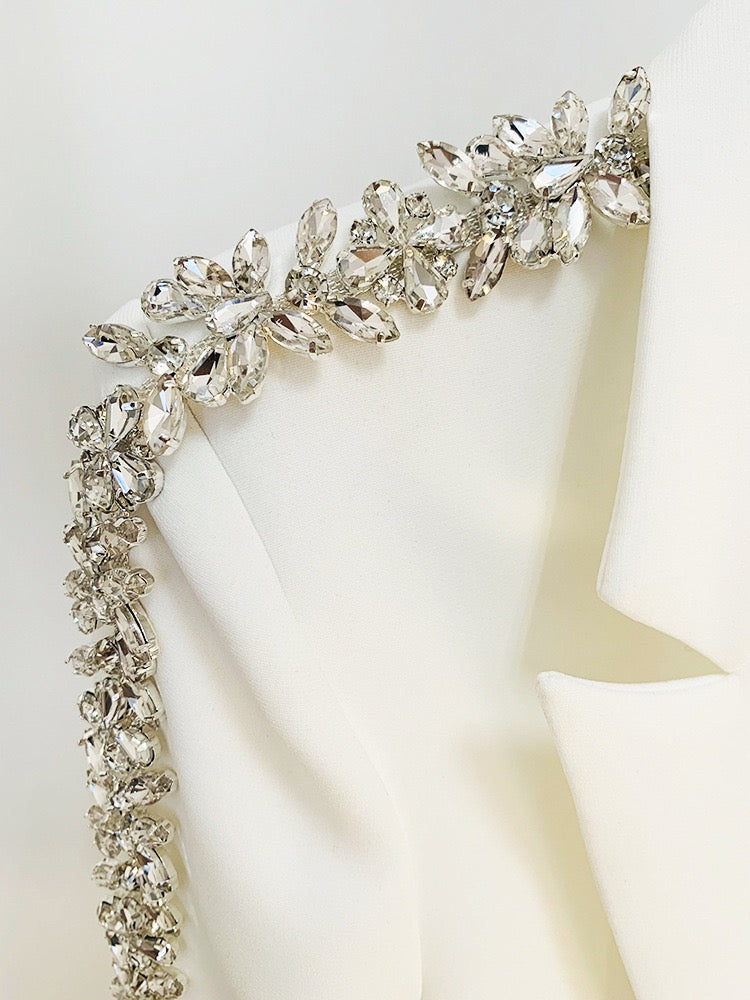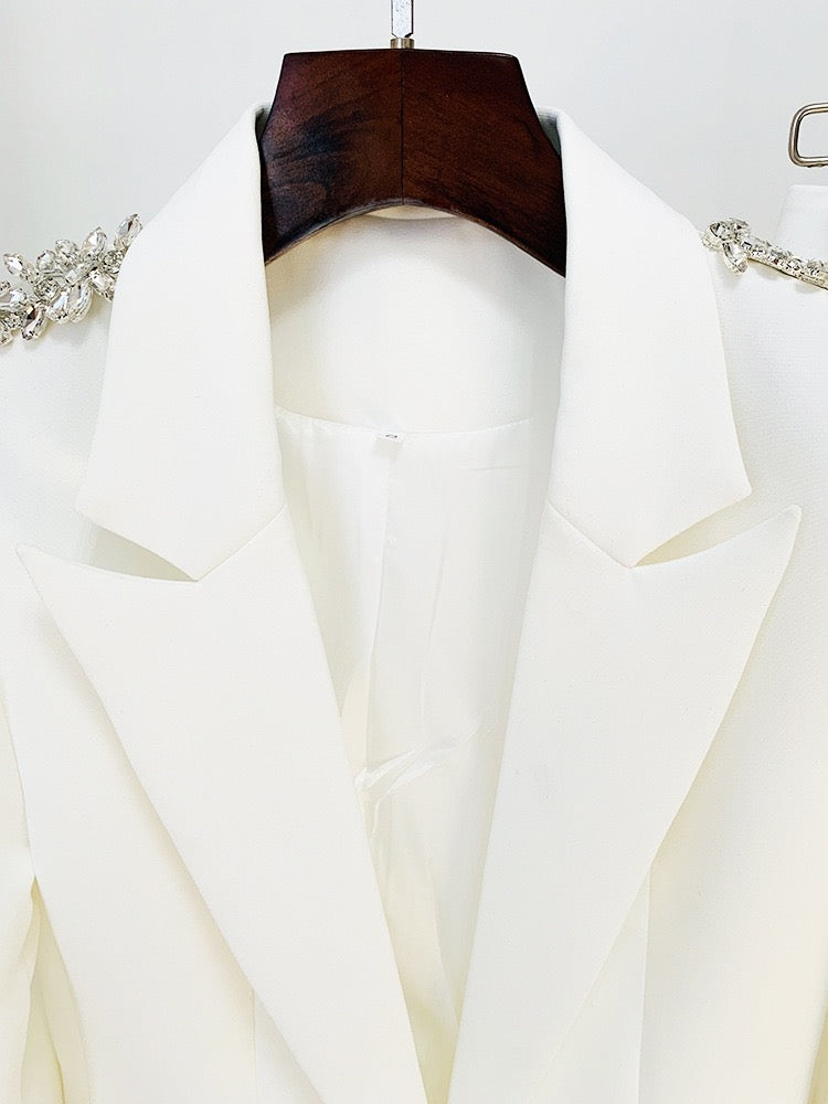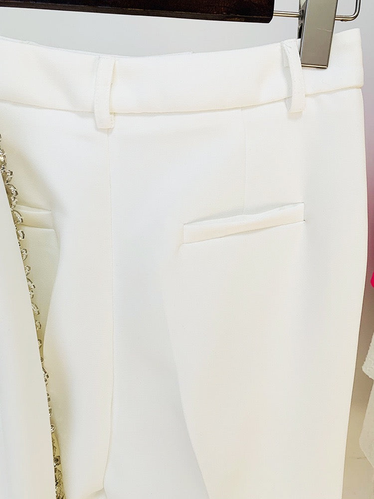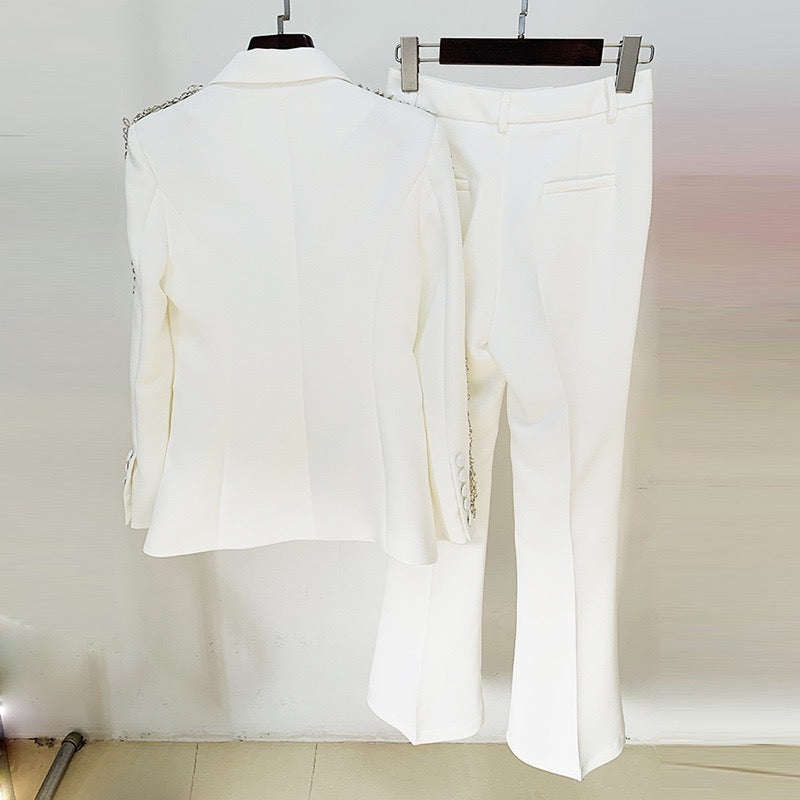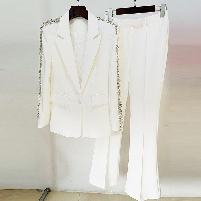 A timeless yet modern two-piece suit set designed for effortless sophistication. This stunning ensemble includes a structured white blazer featuring crystal embellishment along the sleeves for a touch of sparkle, paired with high-waisted flared trousers that create an elongated, elegant silhouette. Crafted from luxurious crepe-blend fabric, it delivers a sleek, tailored fit — perfect for formal events, business occasions, or evening outings where chic minimalism meets subtle glamour.