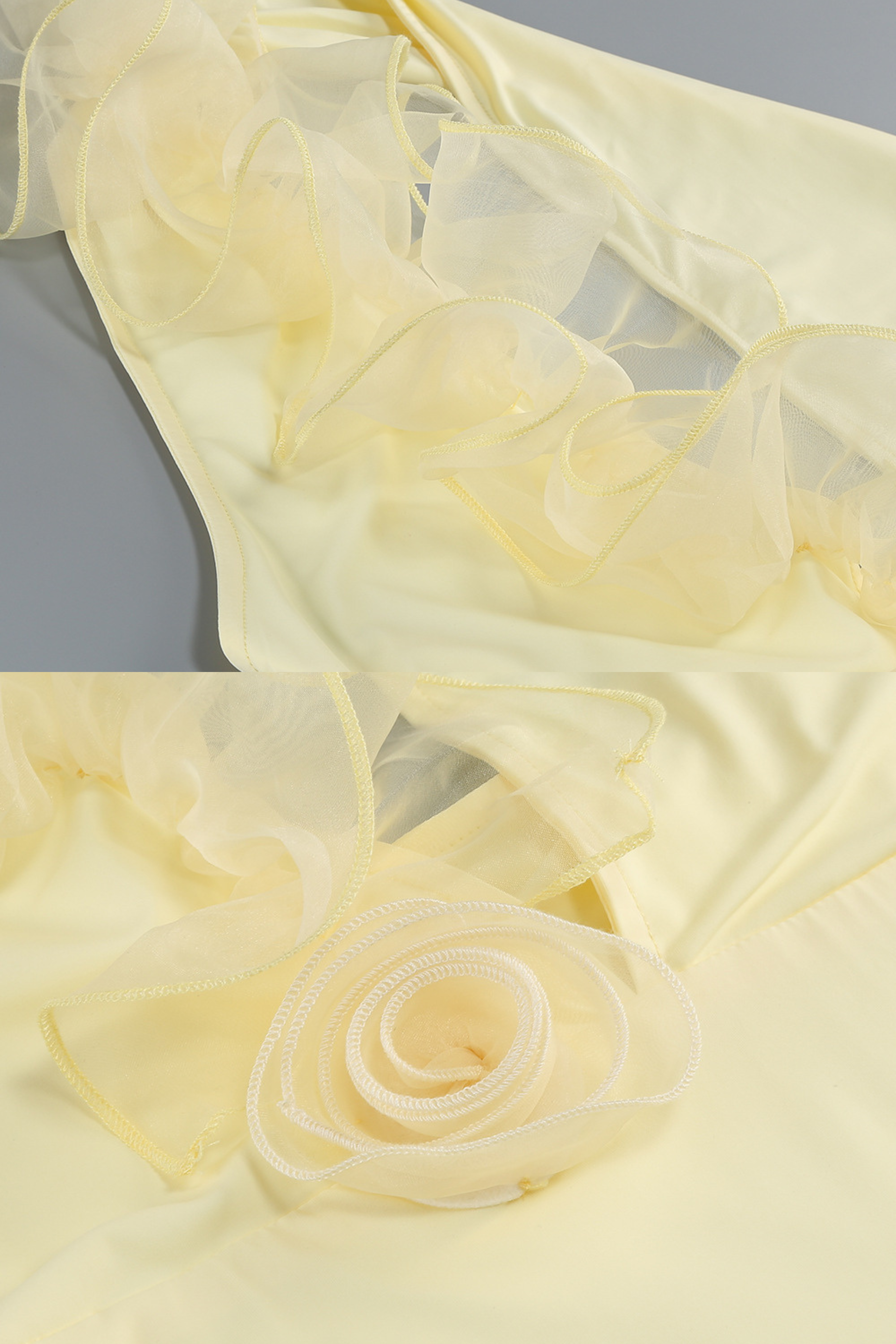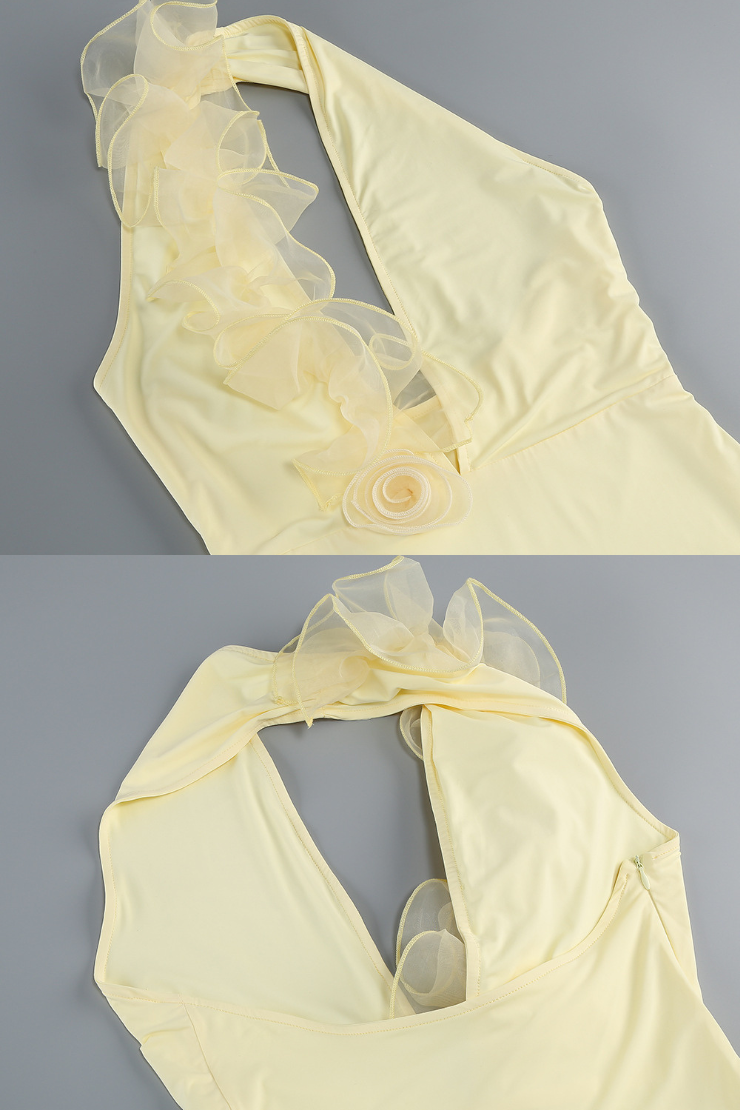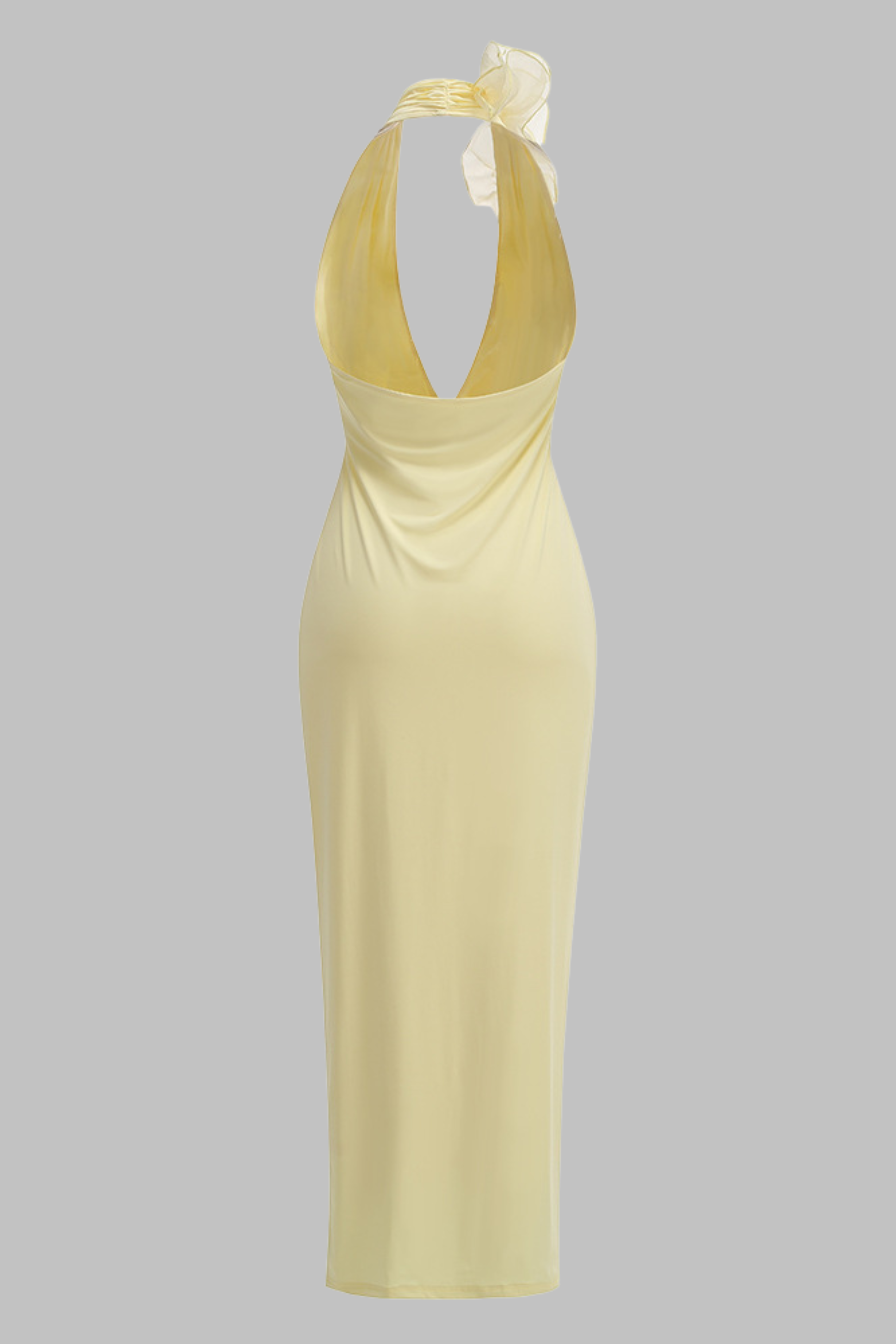 A radiant showstopper, the Lemon Bloom Halter Gown blends soft femininity with sultry elegance. Crafted in a smooth stretch fabric, this slim-fit dress features a daring deep V halter neckline adorned with cascading organza floral ruffles that add dimension and romance. The open back enhances its summer-ready allure, while the floor-length cut elongates the silhouette for a statuesque finish. Perfect for sunset events, summer weddings, or high-glam evenings.