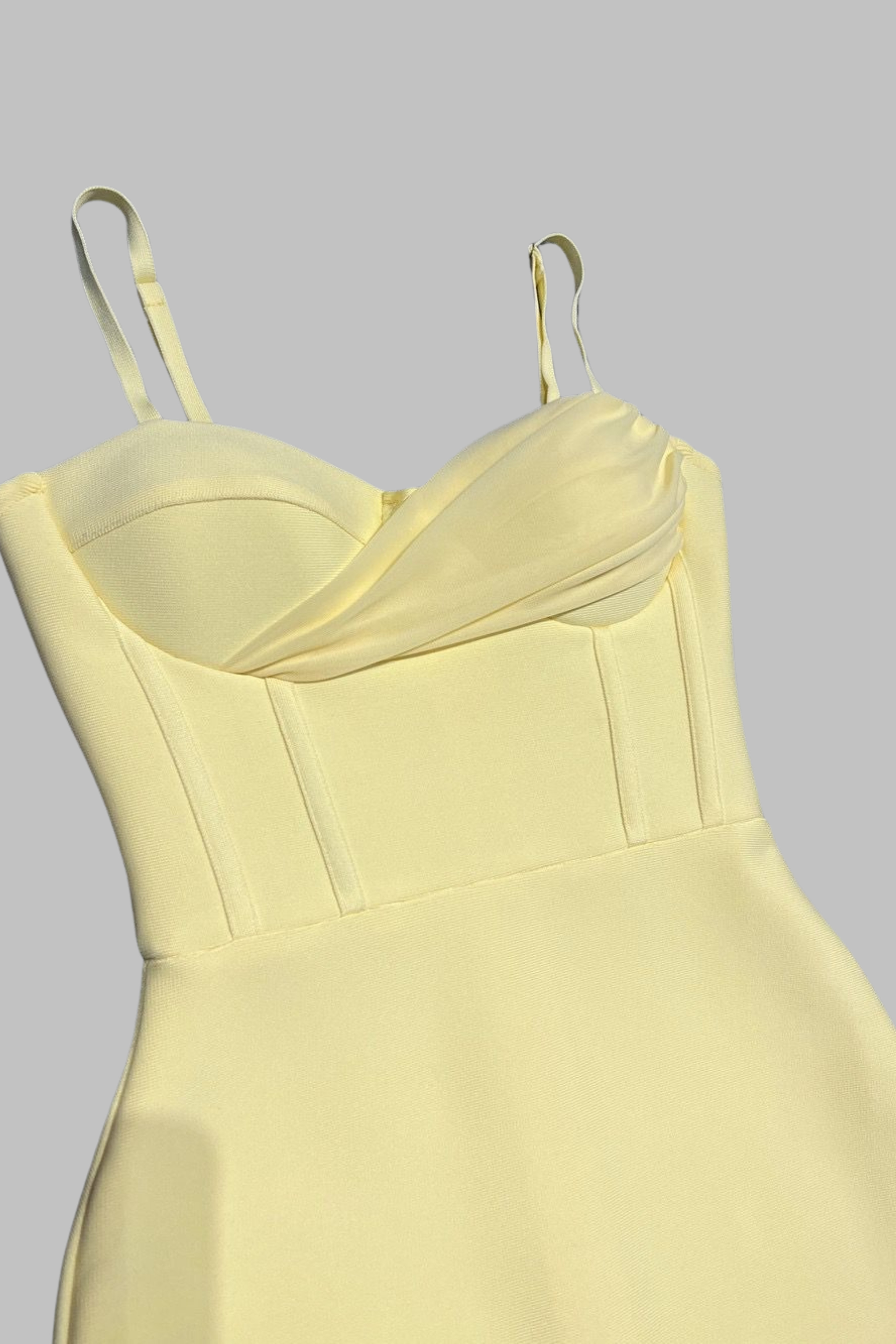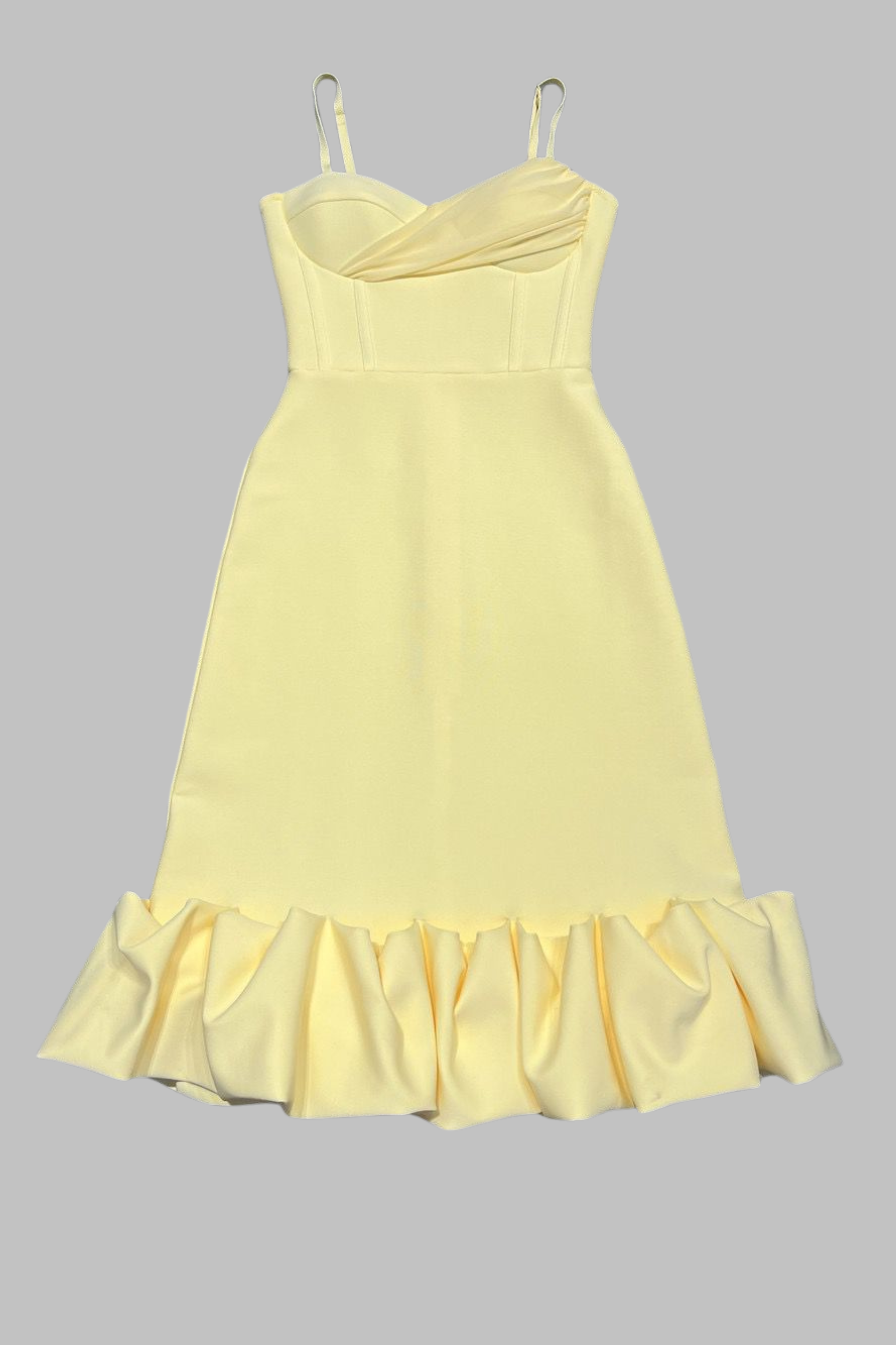 Turn heads in this stunning yellow bandage midi dress, designed with a flattering sweetheart neckline, slim spaghetti straps, and a figure-hugging silhouette. The corset-inspired bodice enhances curves, while the fishtail hem with dramatic ruffle detailing adds elegance and movement. Perfect for weddings, parties, or evening events, this sleeveless dress combines sophistication with a bold, feminine touch.