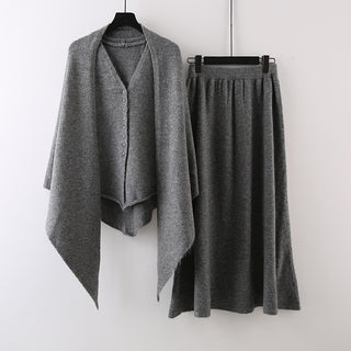 3 Piece Knit Set with Shawl, Buttoned Knit Top and Long Skirt