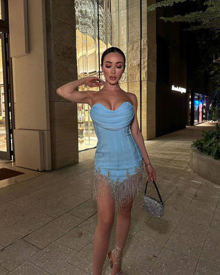Bandage Mini Dress – Short Puff Sleeves with Crystal Heart Embellishment