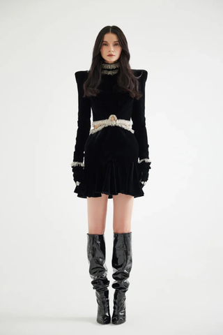 Velvet Long Sleeve Mini Dress with Beaded Fringe and Cutout Waist