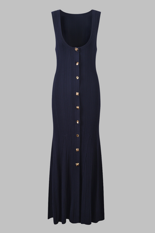 Elegant Navy U-Neck Sleeveless Ribbed Knit Long Dress with Gold Button Front & Flared Hem