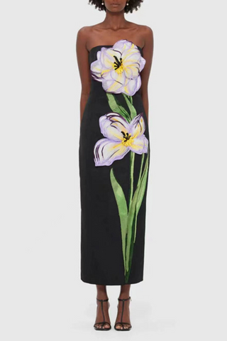 Strapless Floral Embroidered Multicolor 3D Appliqué Slim Fit Long Dress