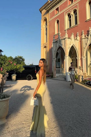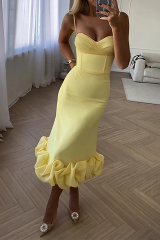 Yellow Sweetheart Neck Bandage Midi Dress with Ruffle Fishtail Hem