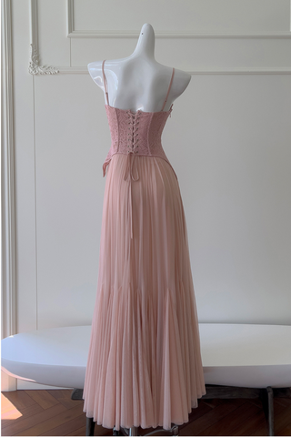 Romantic Blush Lace-Up Corset Maxi Dress with Sweetheart Neckline & Flowing Pleated Skirt