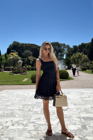 Navy Beaded Hollow Crochet Knit Mini Dress with Crystal Embellishments and Square Neckline