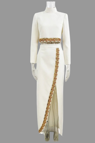 High-Neck Embellished Two-Piece Bridal Set with Long Sleeve Crop Top and Slit Maxi Skirt