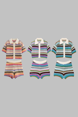Striped Crochet Knit Two-Piece Set with Short Sleeve Button Top and High-Waist Shorts