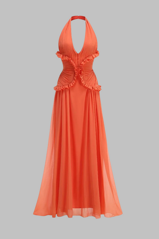 Halter Neck Ruffled Waist Chiffon Long Dress with Flowing Skirt
