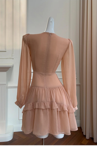 Pleated Chiffon Mini Dress with Long Sleeves and Crystal Embellished Waist