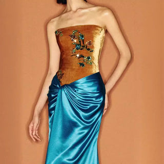 Strapless Velvet and Satin Draped Long Dress with Sequin Floral Embellishment