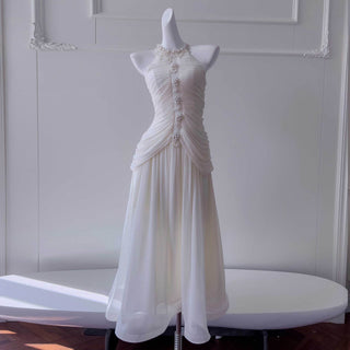 Halter Neck Draped Chiffon Mid-Long Dress with Pearl Embellishments