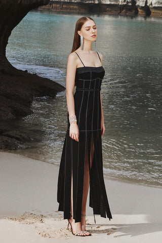 Spaghetti Strap Denim Long Dress with Contrast Stitching and Front Slit