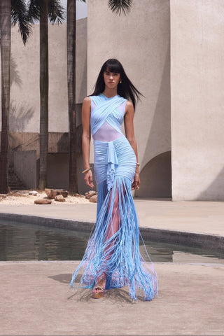 Sleeveless Ruched Mesh Long Dress with Fringed Hem and Crisscross Draping