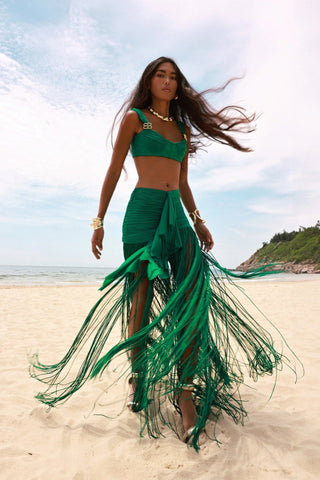Two-Piece Ruched Crop Top and Fringed Maxi Skirt Set with Gold Buckle Detail