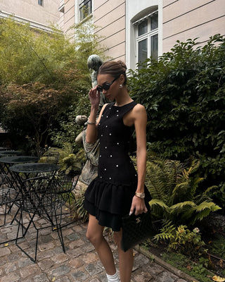 Sleeveless Pearl-Embellished Mini Dress with Layered Ruffled Hem
