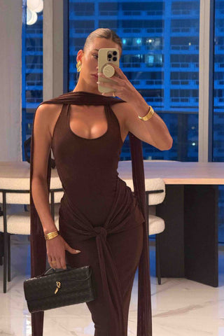 Chocolate Brown Halter Neck Long Dress – Sculpted Bodycon Gown with Braided Trim