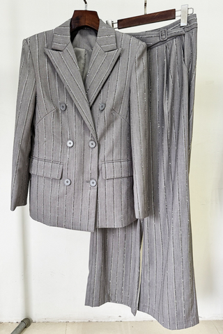 Crystal Pinstripe Diamond Trimmed Blazer & Wide-Leg Trousers Set