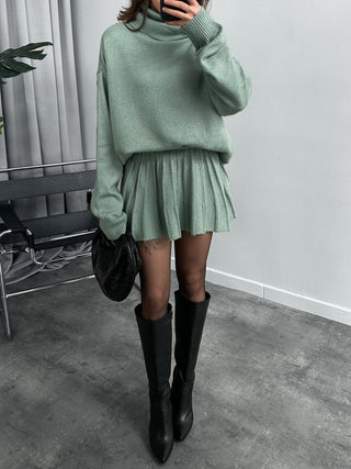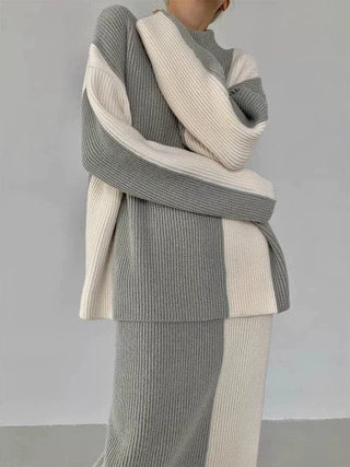 Cozy Ribbed Knit Two-Piece Set - Turtleneck Sweater and Midi Skirt