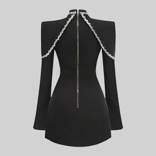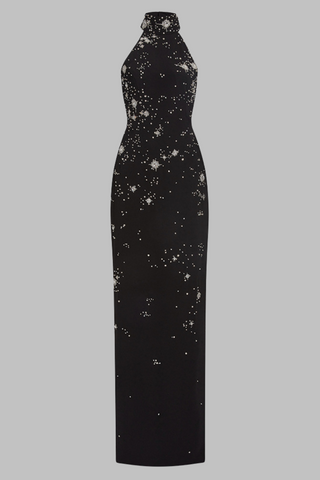 Crystal Starburst Halter Long Dress with Side Slit and High Neck Embellishment