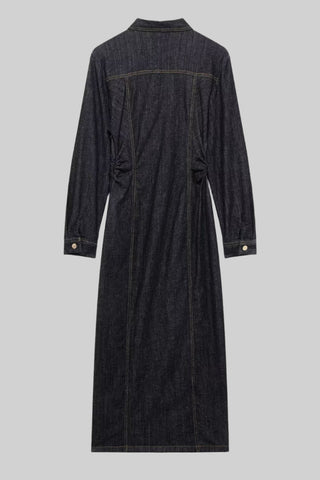 Dark Wash Button-Up Denim Long Midi Dress with Long Sleeves and Pocket Detail
