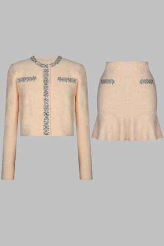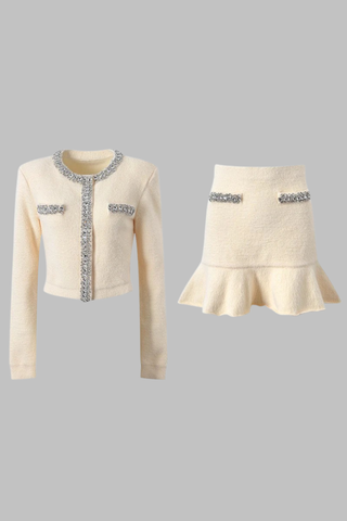 Crystal-Embellished Soft Wool Set – Cream Beige Cropped Jacket and Ruffled Mini Skirt