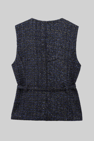 Elegant Tweed Belted Vest – Sleeveless Round Neck Textured Jacket with Gold Button Details