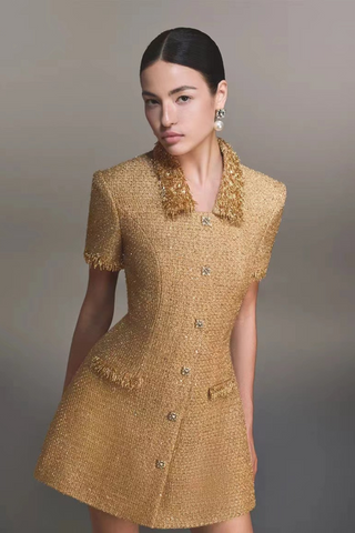 Gold Sequin Tweed Mini Dress with Beaded Fringe and Embellished Buttons