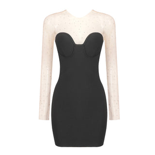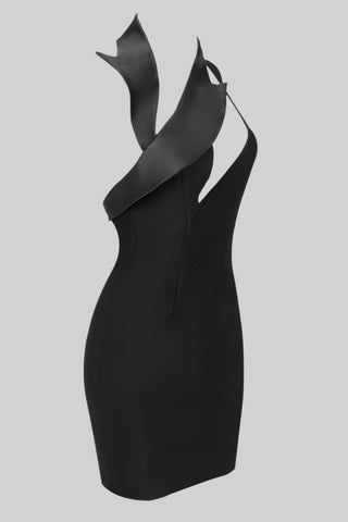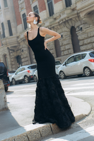 Glamorous Black Mermaid Long Dress Sleeveless Scoop Neck, Glitter Knit Bodice with 3D Rosette Feathered Skirt