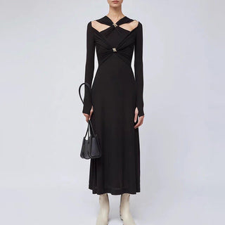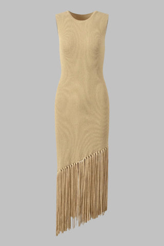 Golden Beige Knit Midi Dress with Asymmetrical Fringe Detail