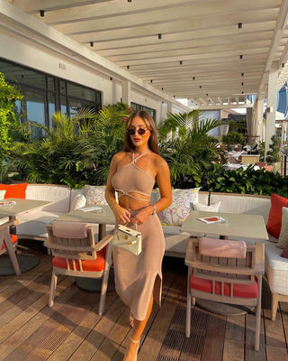 Gray Knitted V-Neck Sweater Comfy Set with Wide-Leg Pants & Scarf