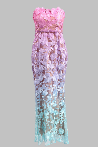 Ombre Floral Lace Strapless Long Dress – Gradient Pink, Purple & Aqua Embroidery