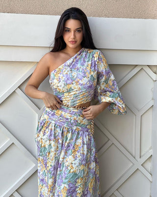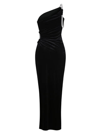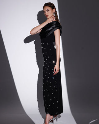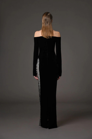 Off-Shoulder Long Sleeve Long Dress with Crystal-Embellished Sheer Panel