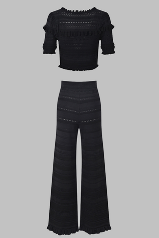 Black Textured Knit Ruffle Crop Top & High-Waist Wide-Leg Pants Set