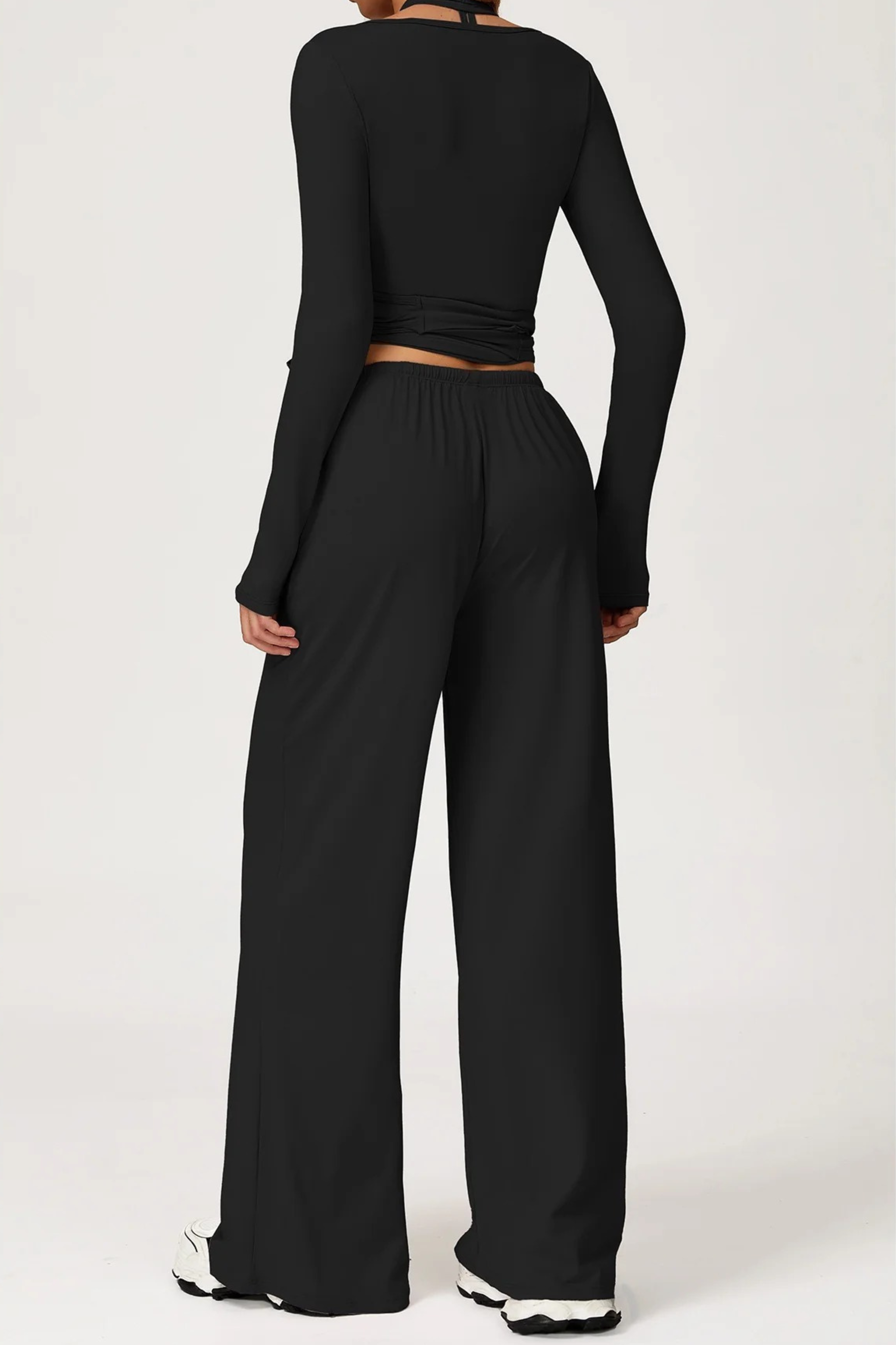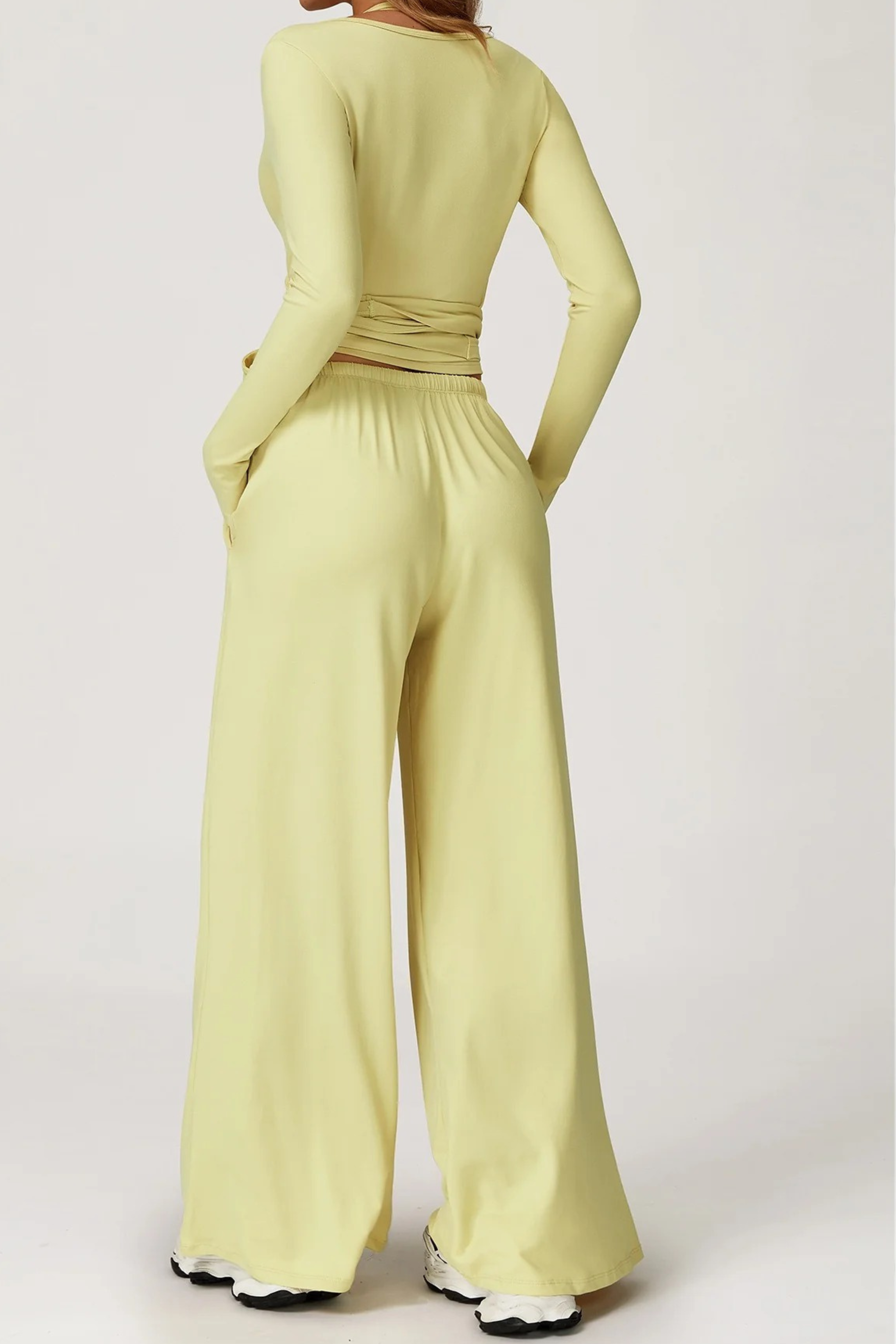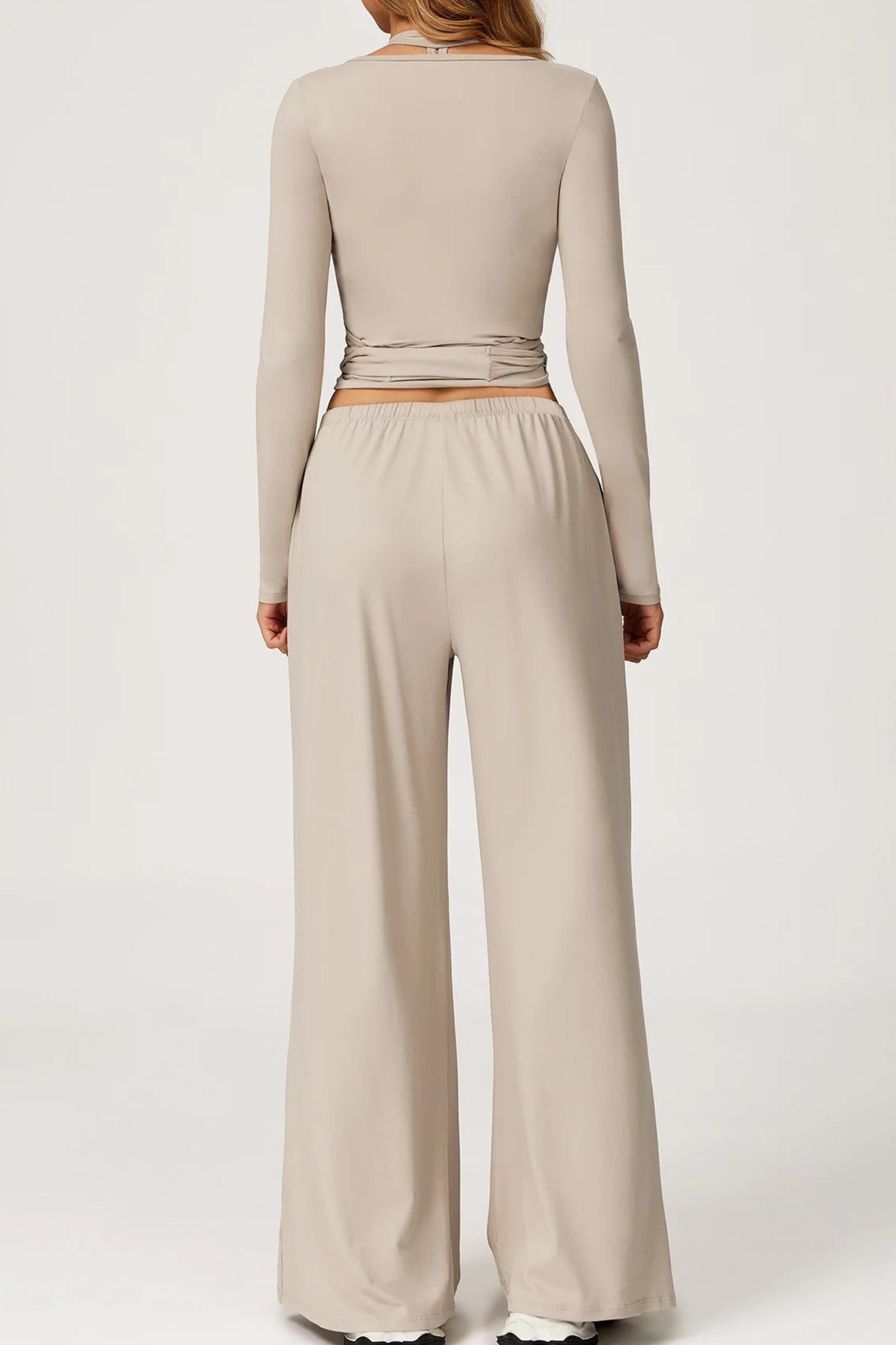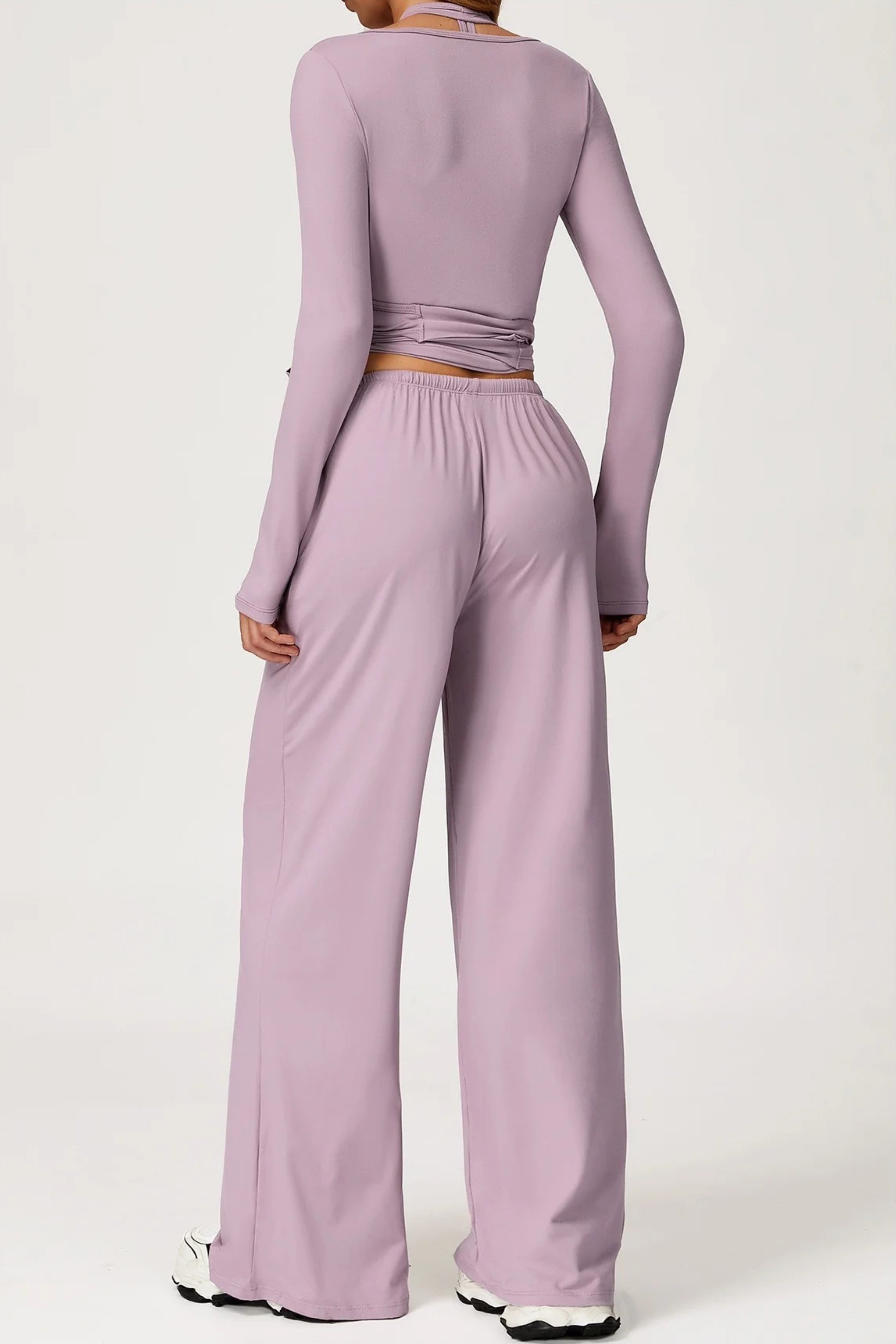 Upgrade your athleisure style with this 3-piece sport lounge set. Featuring a halter crop tank, a long sleeve wrap tie crop top, and relaxed wide-leg drawstring pants, it’s the perfect mix of comfort and style. Crafted from soft, stretchy fabric, this set is ideal for yoga, lounging, travel, or everyday wear while keeping you effortlessly chic.