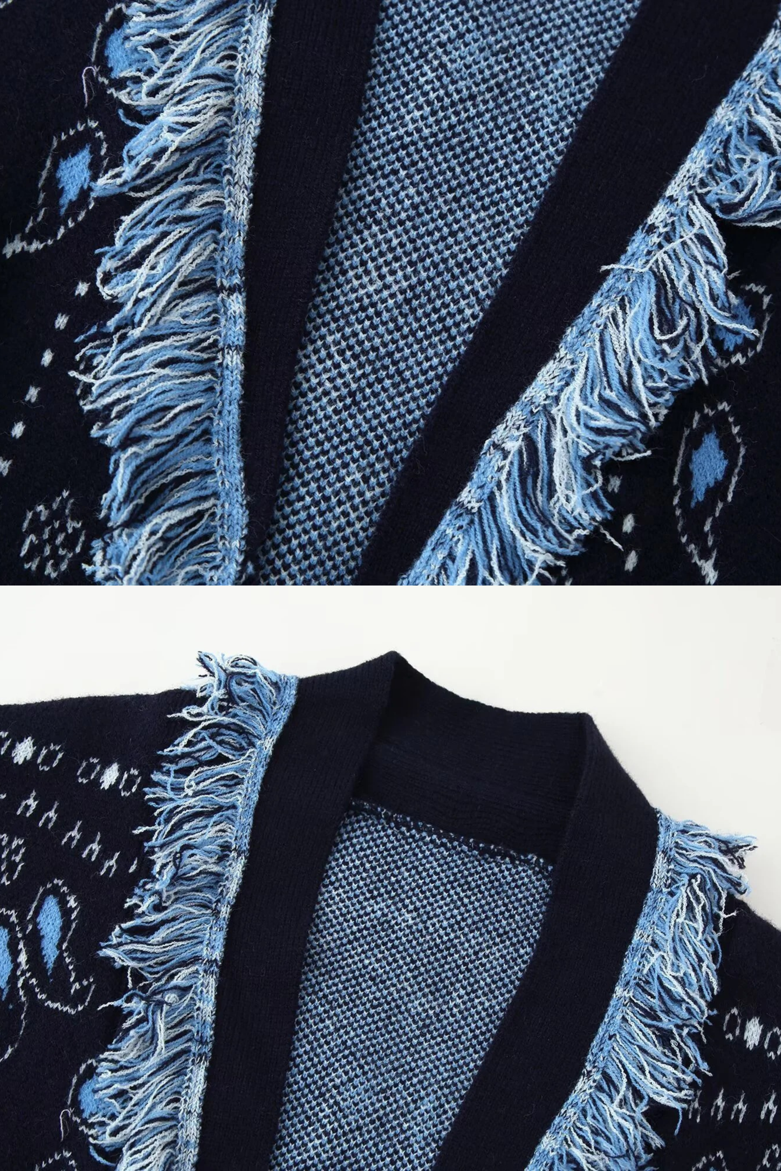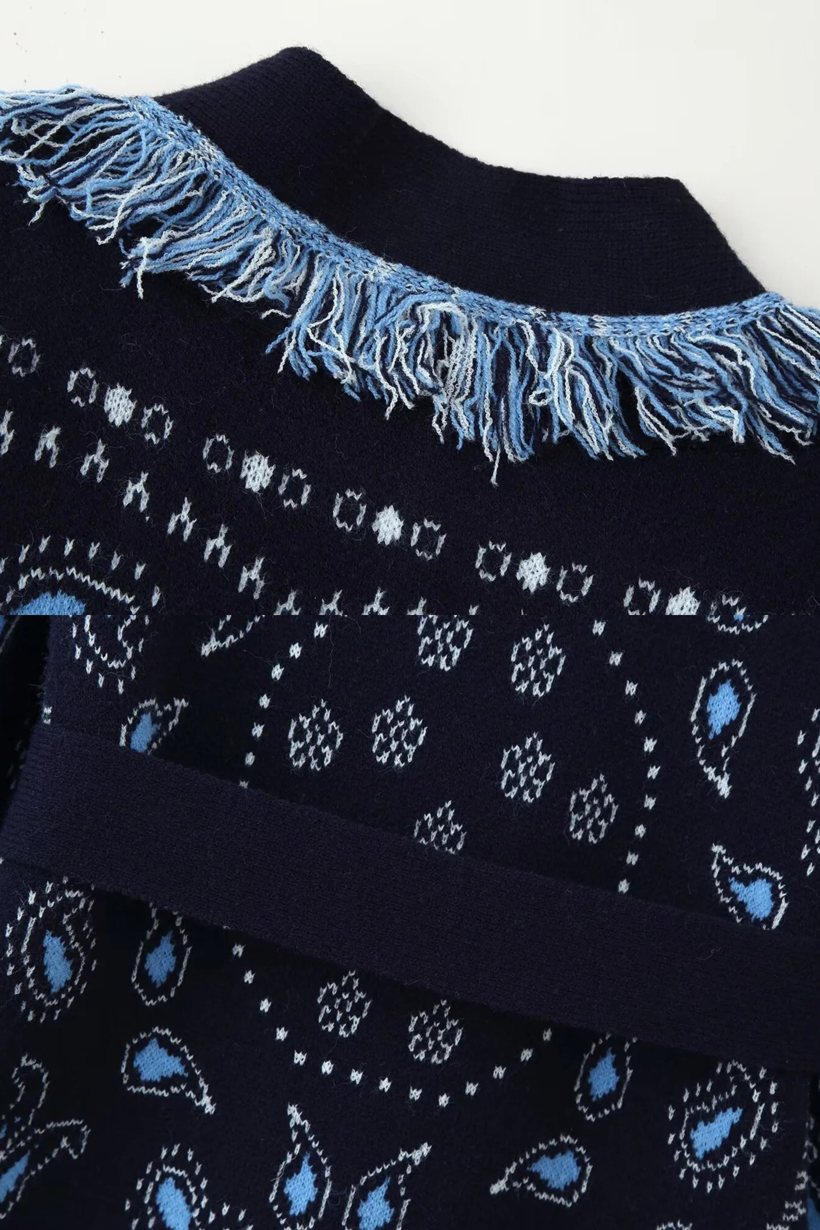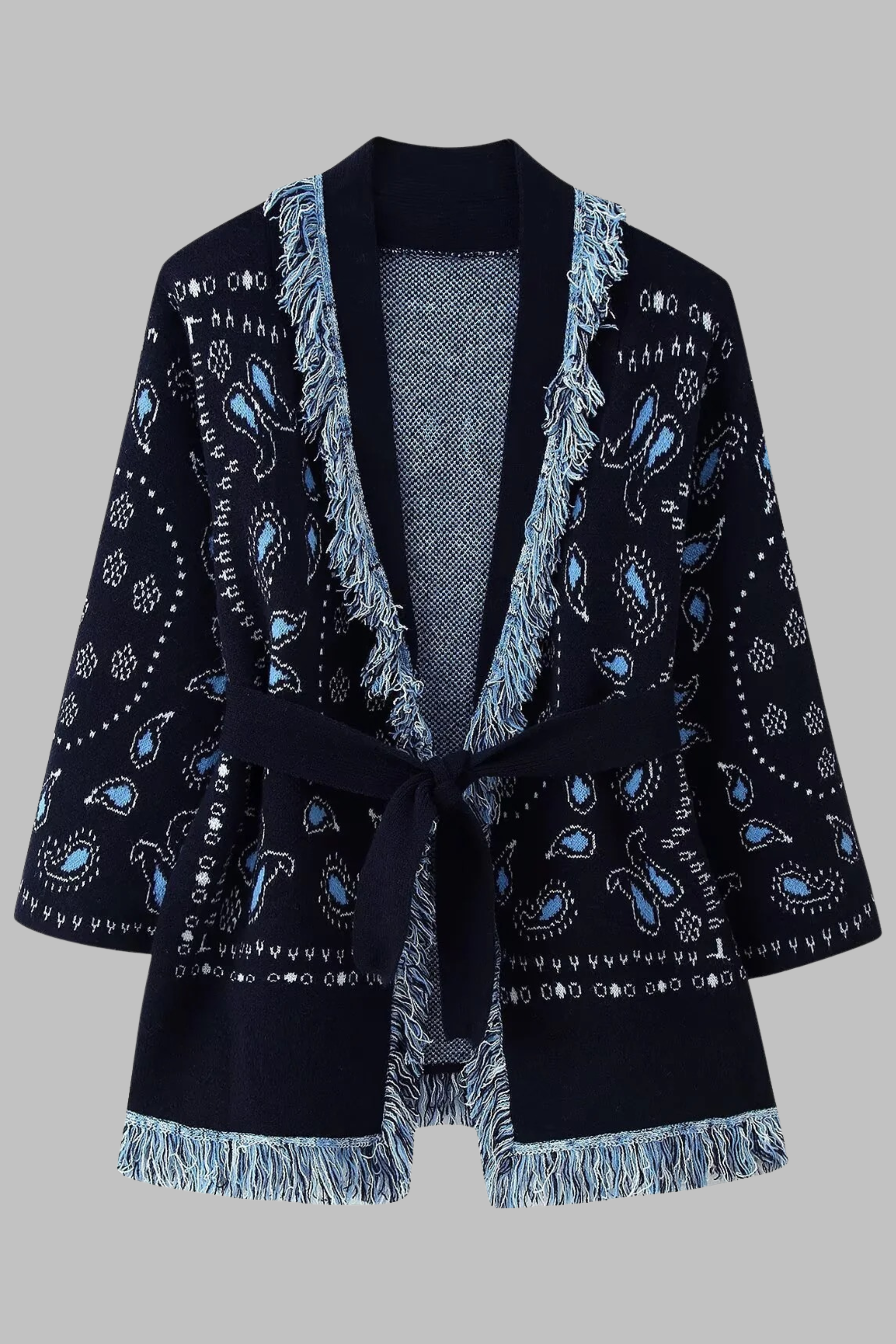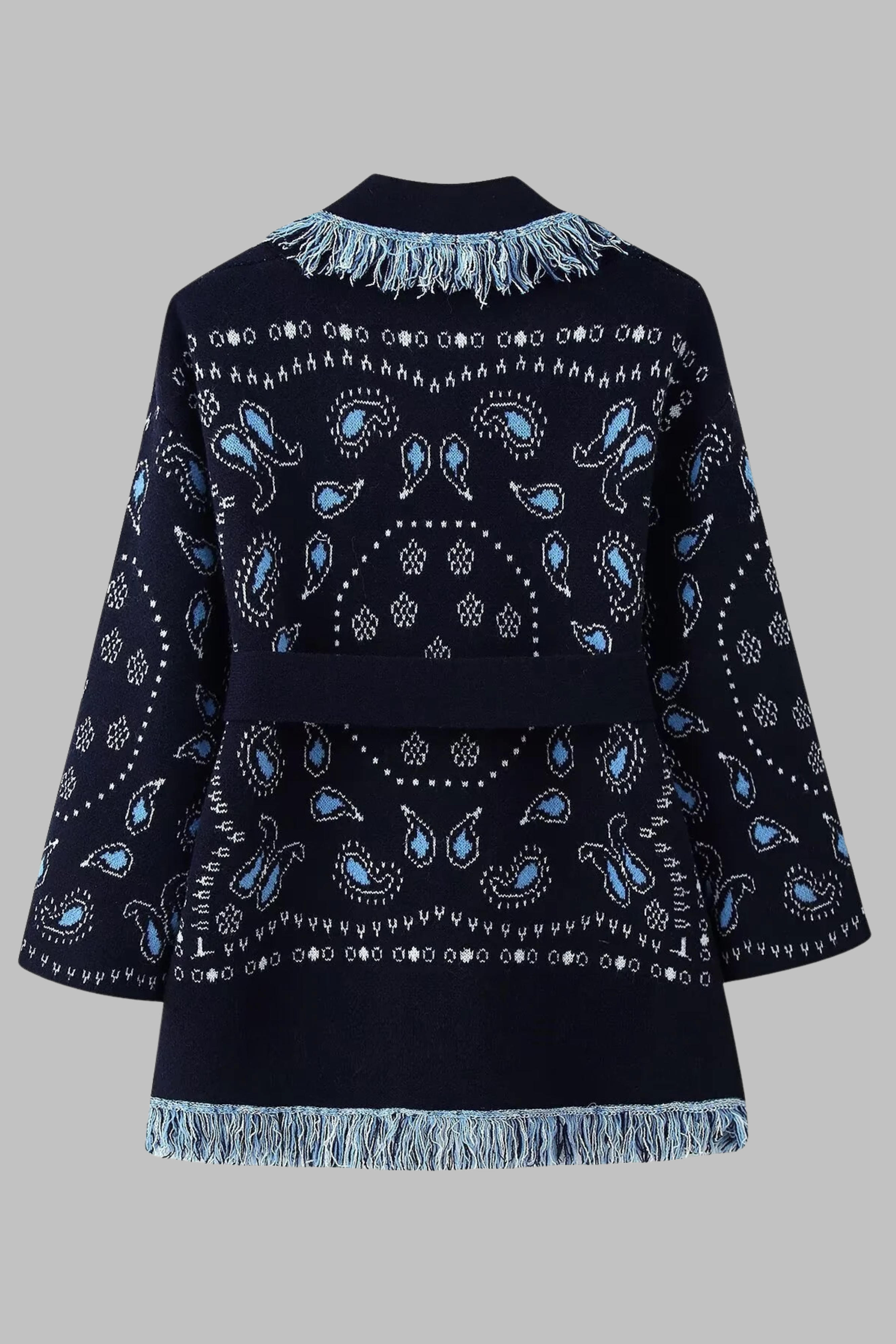 Boho Fringe Knit Cardigan – Jacquard Pattern, Long-Sleeve, Belted Design