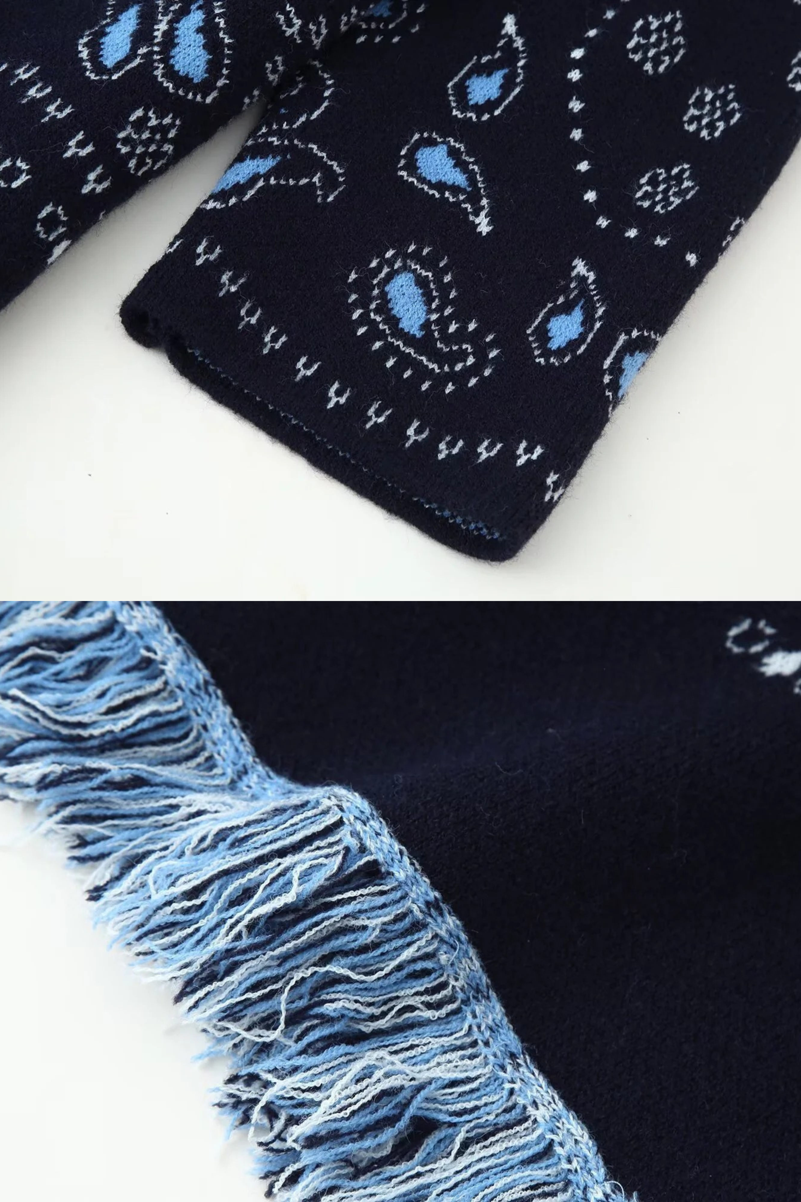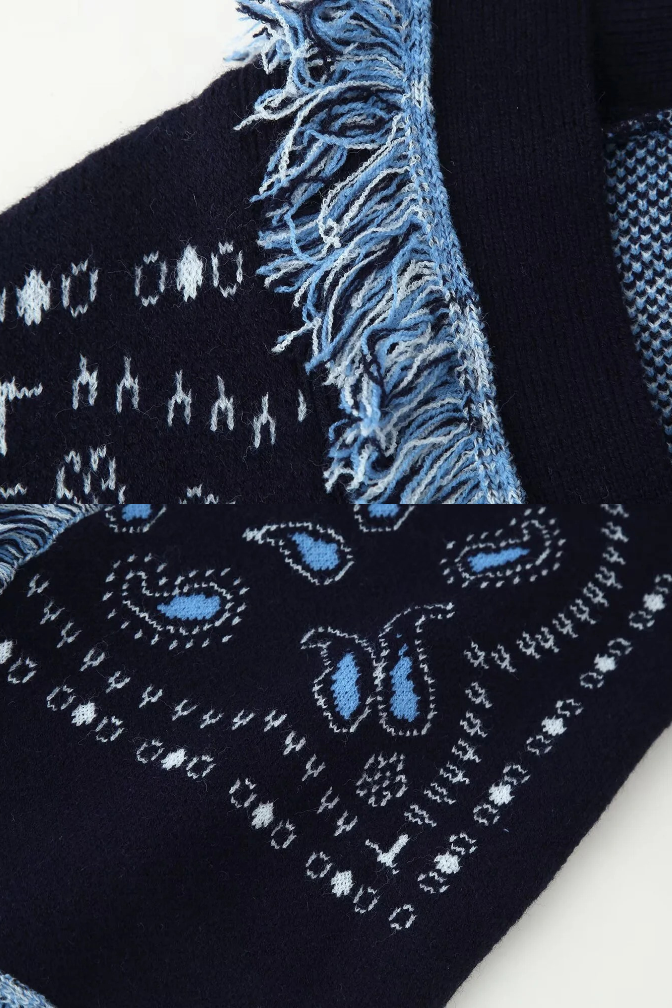 A cozy knit cardigan featuring a detailed jacquard boho pattern, soft mid-sleeves, and statement fringe trim. Made from a warm knit blend with a belted wrap design for an easy, flattering fit. Perfect for casual layering with a touch of boho elegance.