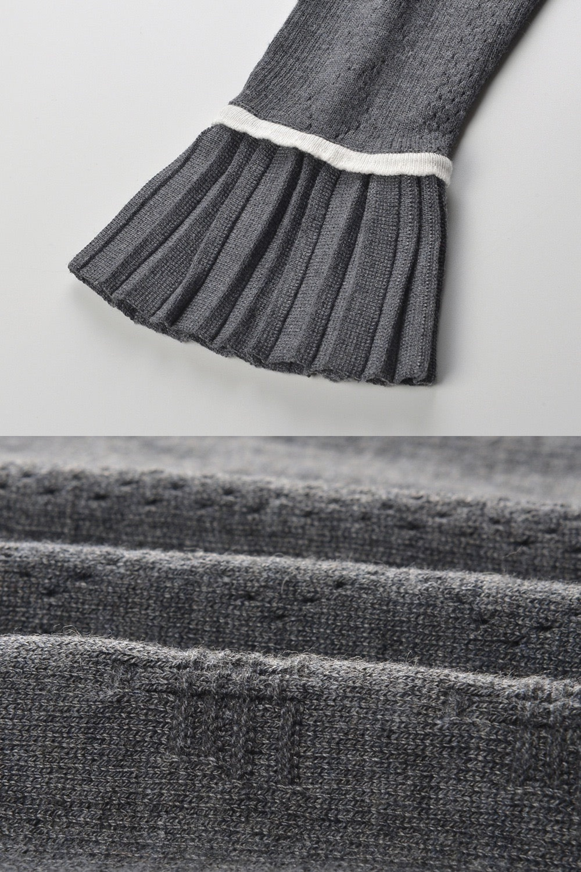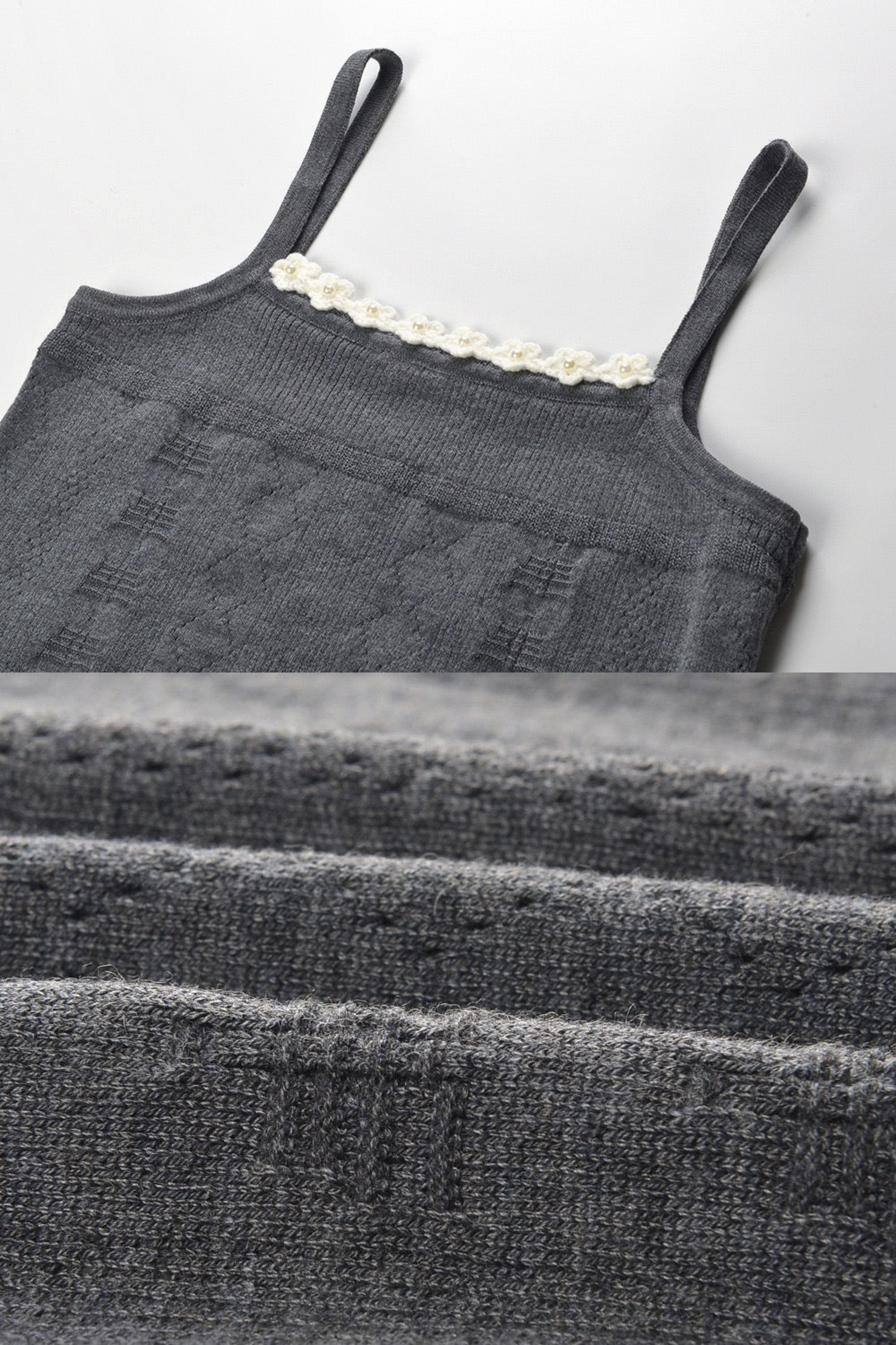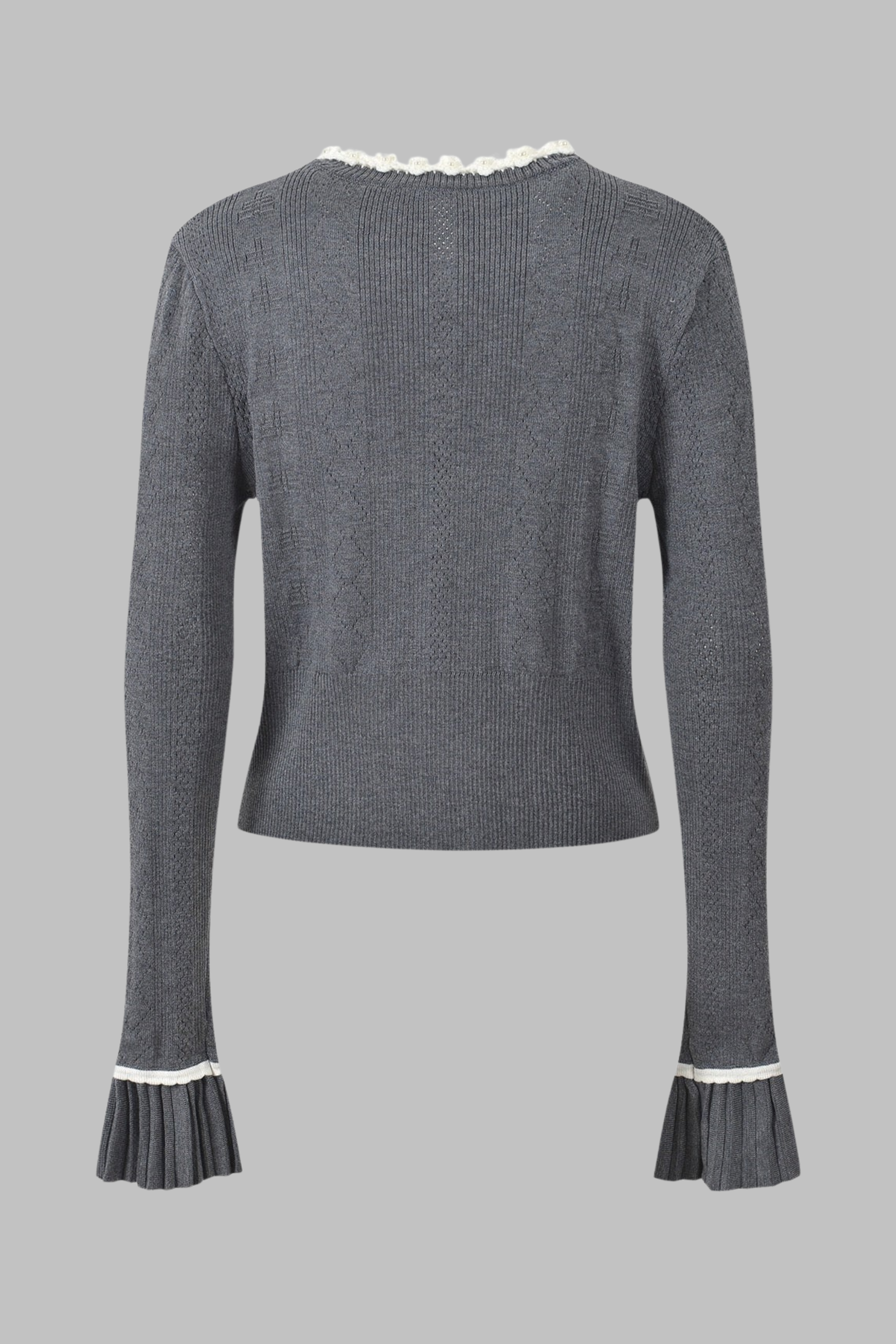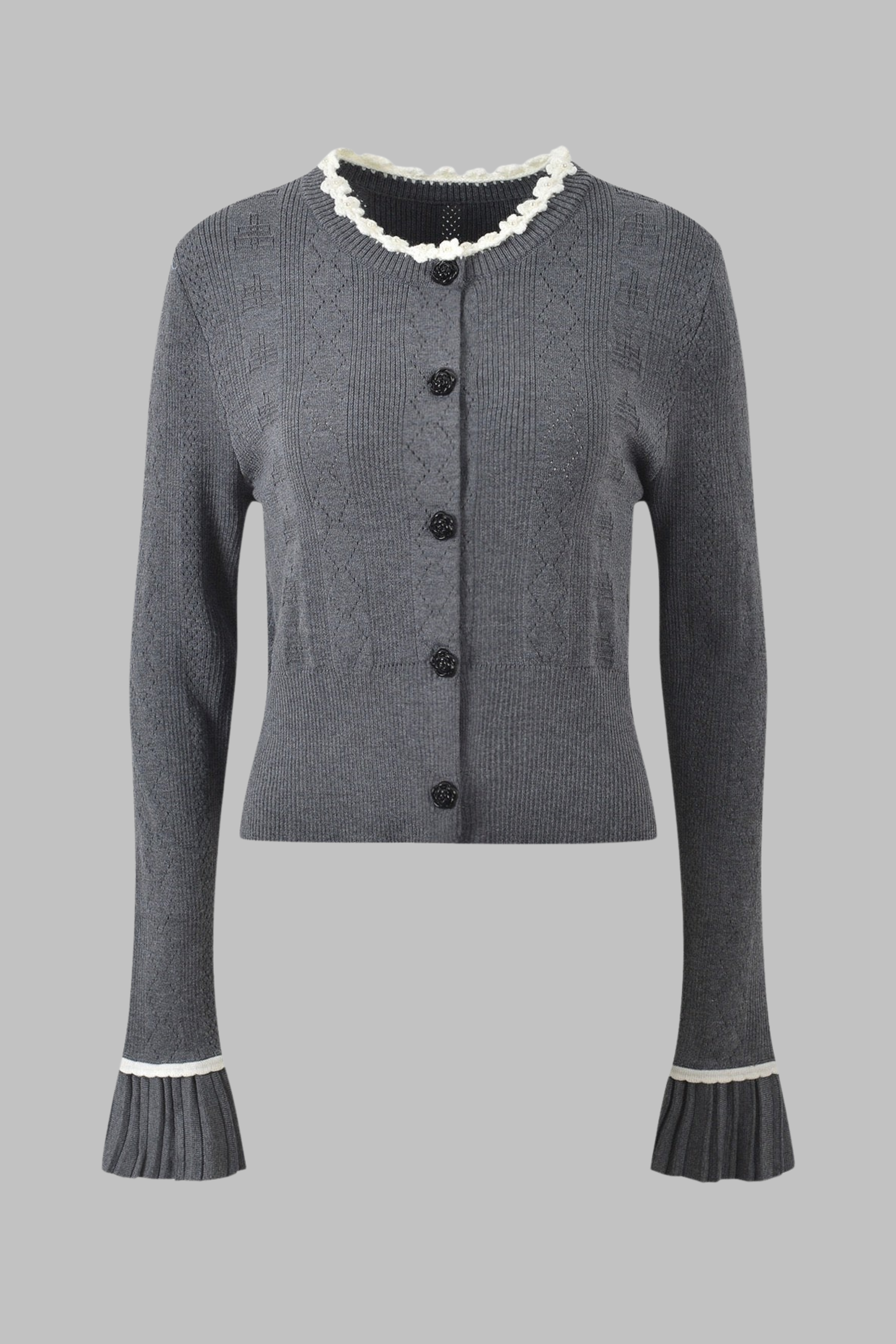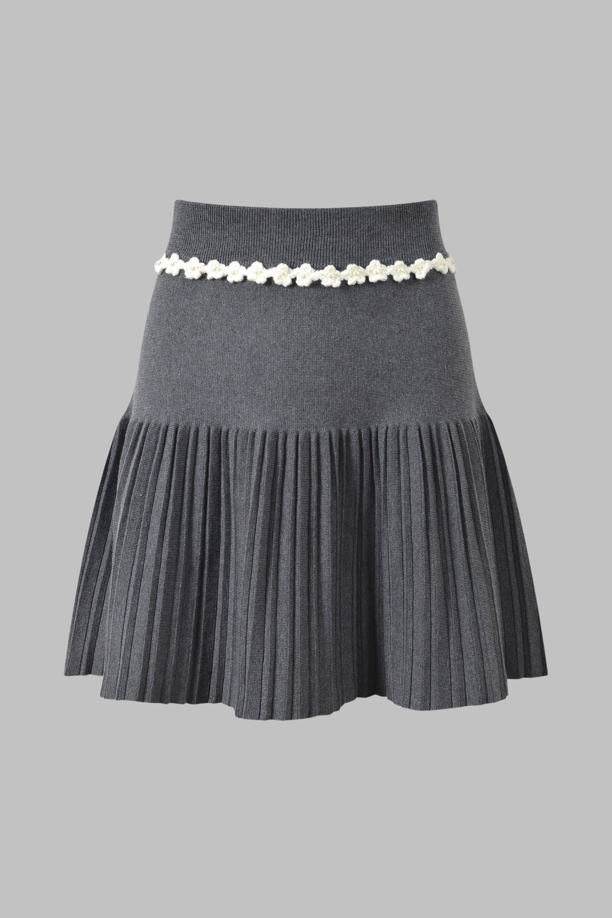 Elegant and playful, this charcoal gray knitted set features a cropped cardigan, sleeveless top, and pleated mini skirt — all beautifully detailed with white floral trim along the neckline, cuffs, and waistband. Made from soft ribbed knit fabric for a comfortable yet structured fit, this three-piece ensemble blends sophistication with a touch of romantic charm, perfect for chic daytime or evening looks.
