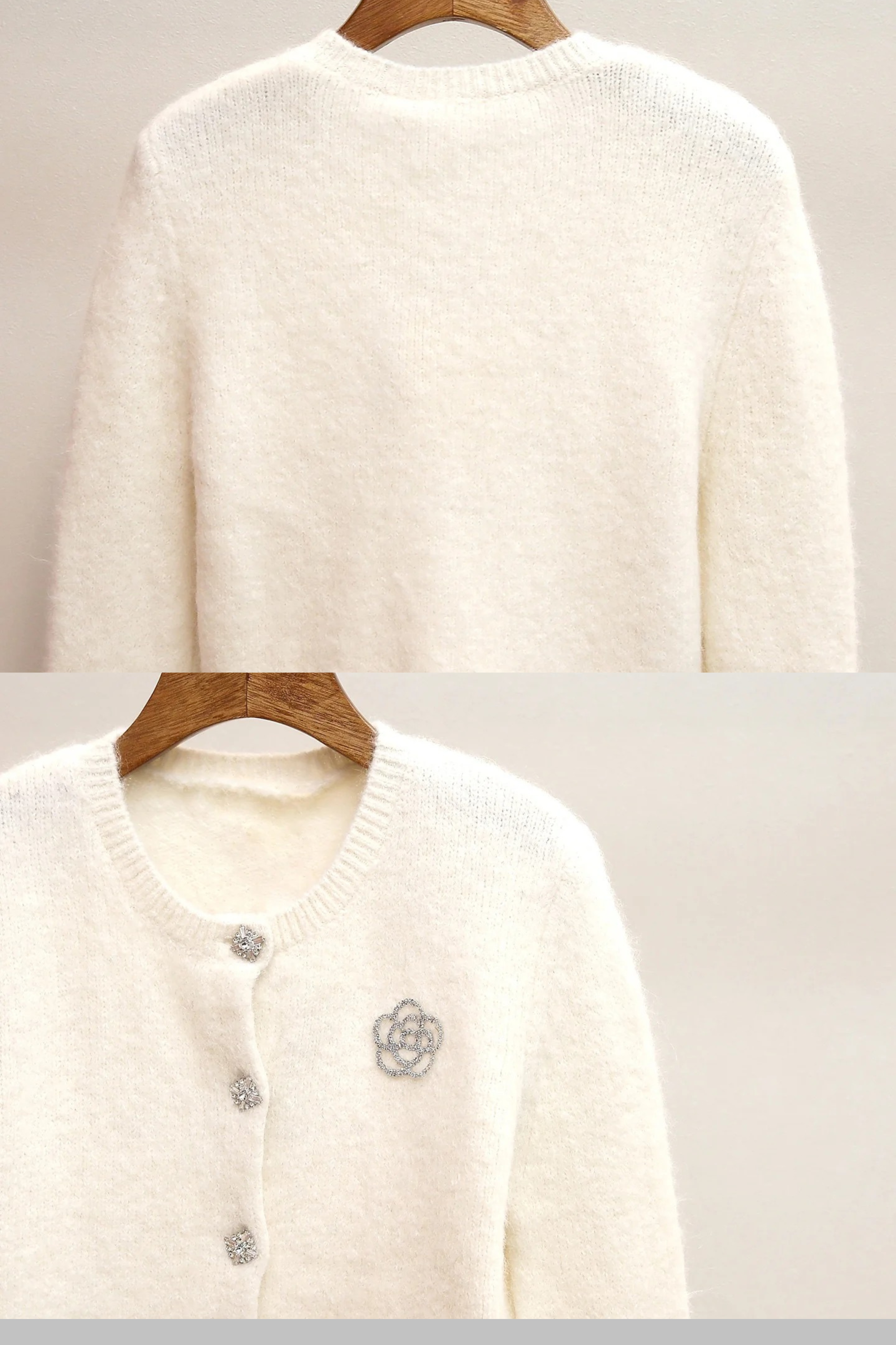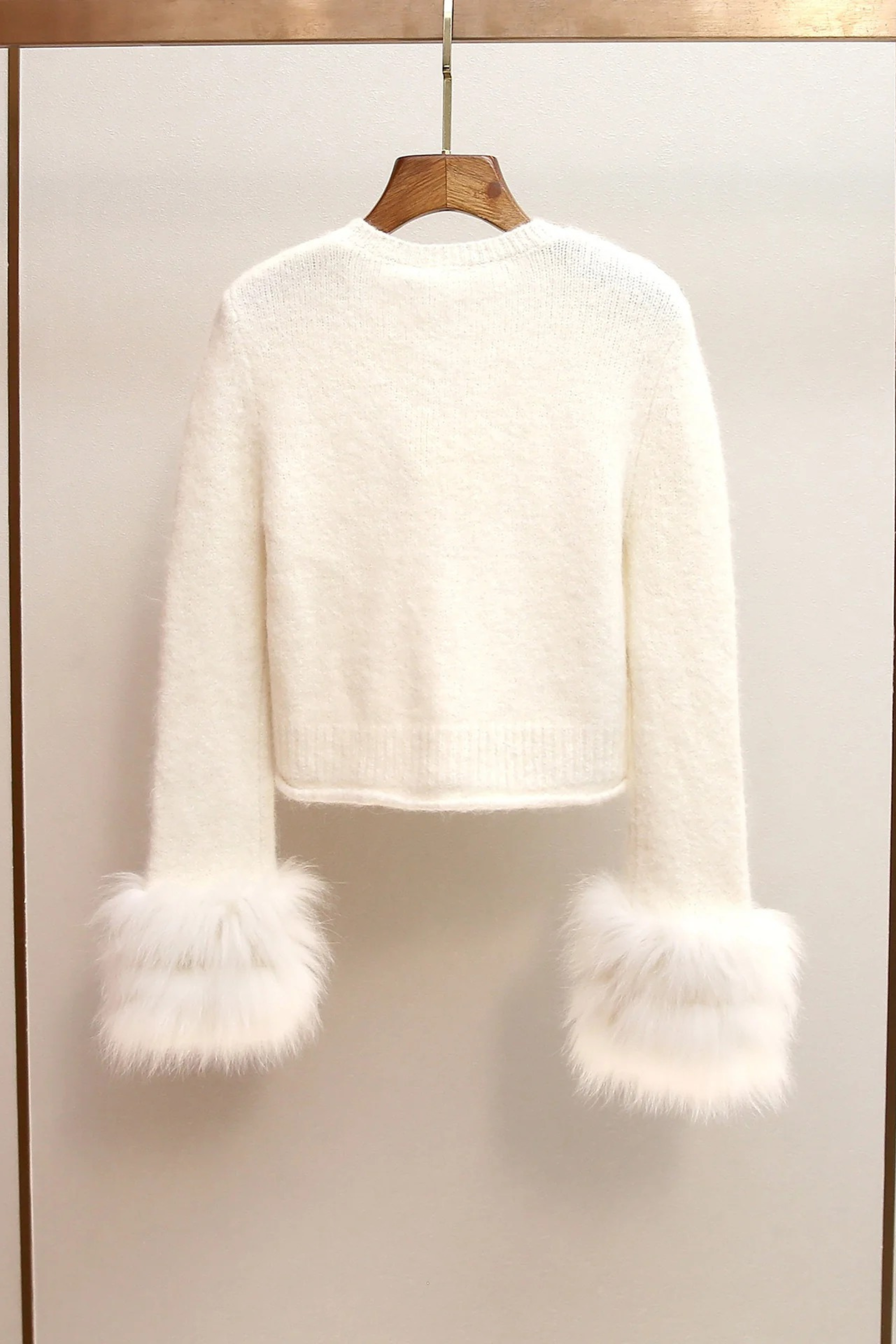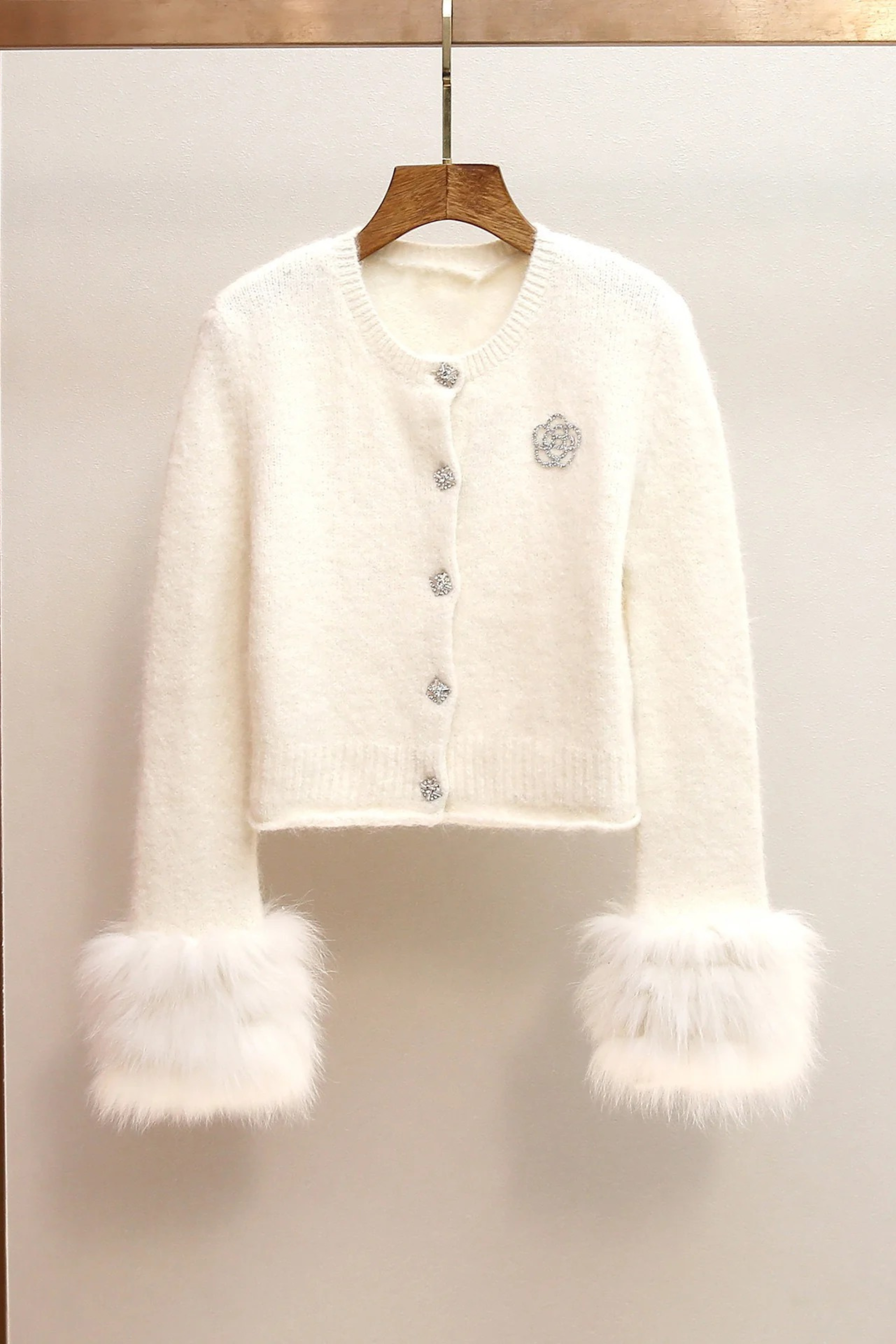 A soft fuzzy knit cardigan designed with sparkling crystal buttons, a delicate floral embellishment, and luxurious faux fur cuffs. This cropped winter layer adds a chic feminine touch to any outfit—perfect for cozy, elegant, and dressy looks.